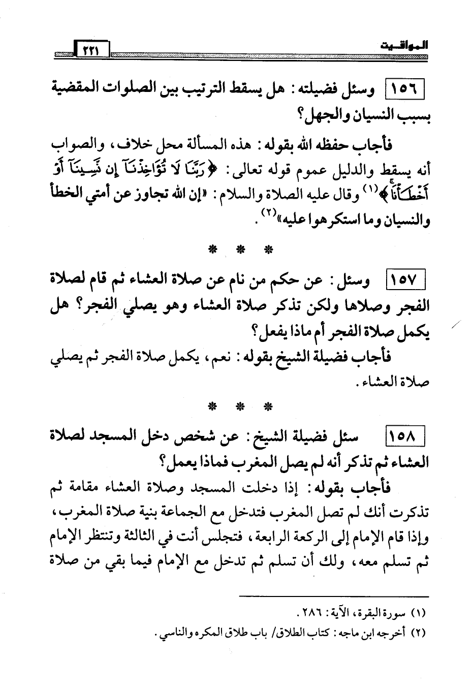 156) وسئل فضيلته: هل يسقط الترتيب بين الصلوات المقضية بسبب النسيان والجهل؟