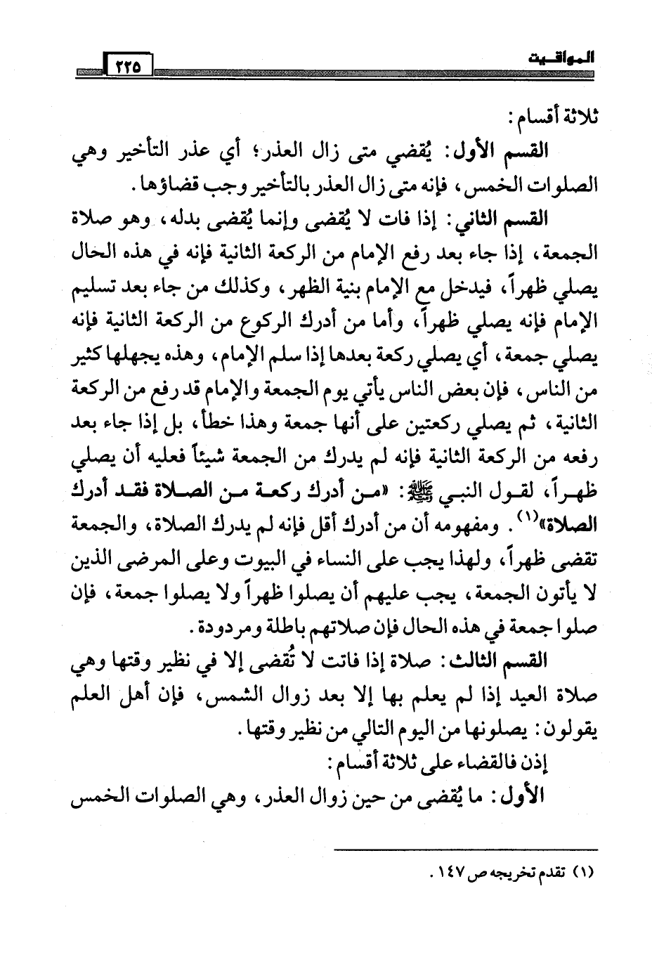القسم الأول: يقضي متى زال العذر، أي عذر التأخير وهي الصلوات الخمس، فإنه متى زال العذر بالتأخير وجب قضاؤها.