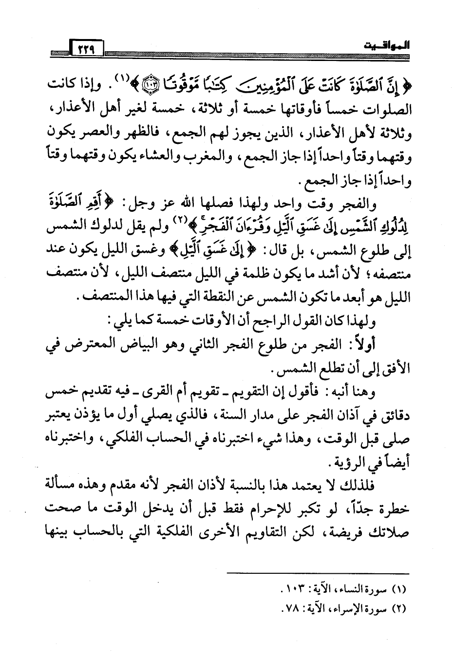 إِنَّ الصَّلاةَ كَانَتْ عَلَى الْمُؤْمِنِينَ كِتَاباً مَوْقُوتاً) (103) (¬1) . وإذا كانت الصلوات خمساً فأوقاتها خمسة أو ثلاثة، خمسة لغير أهل الأعذار، وثلاثة لأهل الأعذار، الذين يجوز لهم الجمع، فالظهر والعصر يكون وقتهما وقتاً واحداً إذا جاز الجمع، والمغرب والعشاء يكون وقتهما وقتاً واحداً إذا جاز الجمع.
