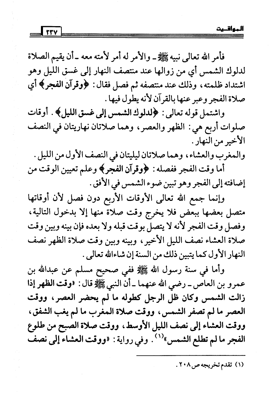 وأما في سنة رسول الله صلي الله عليه وسلم ففي صحيح مسلم عن عبد الله بن عمرو بن العاص – رضي الله عنهما – أن النبي صلي الله عليه وسلم قال " وقت الظهر إذا زالت الشمس وكان ظل الرجل كطوله ما لن يحضر وقت العصر، ووقت العصر ما لم تصفر الشمس،ووقت صلاة المغرب ما لم يغيب الشفق، ووقت العشاء إلي نصف الليل الأوسط، ووقت صلاة الصبح من طلوع الفجر ما لم تطلع الشمس " (¬1) وفي رواية: وقت العشاء إلي نصف