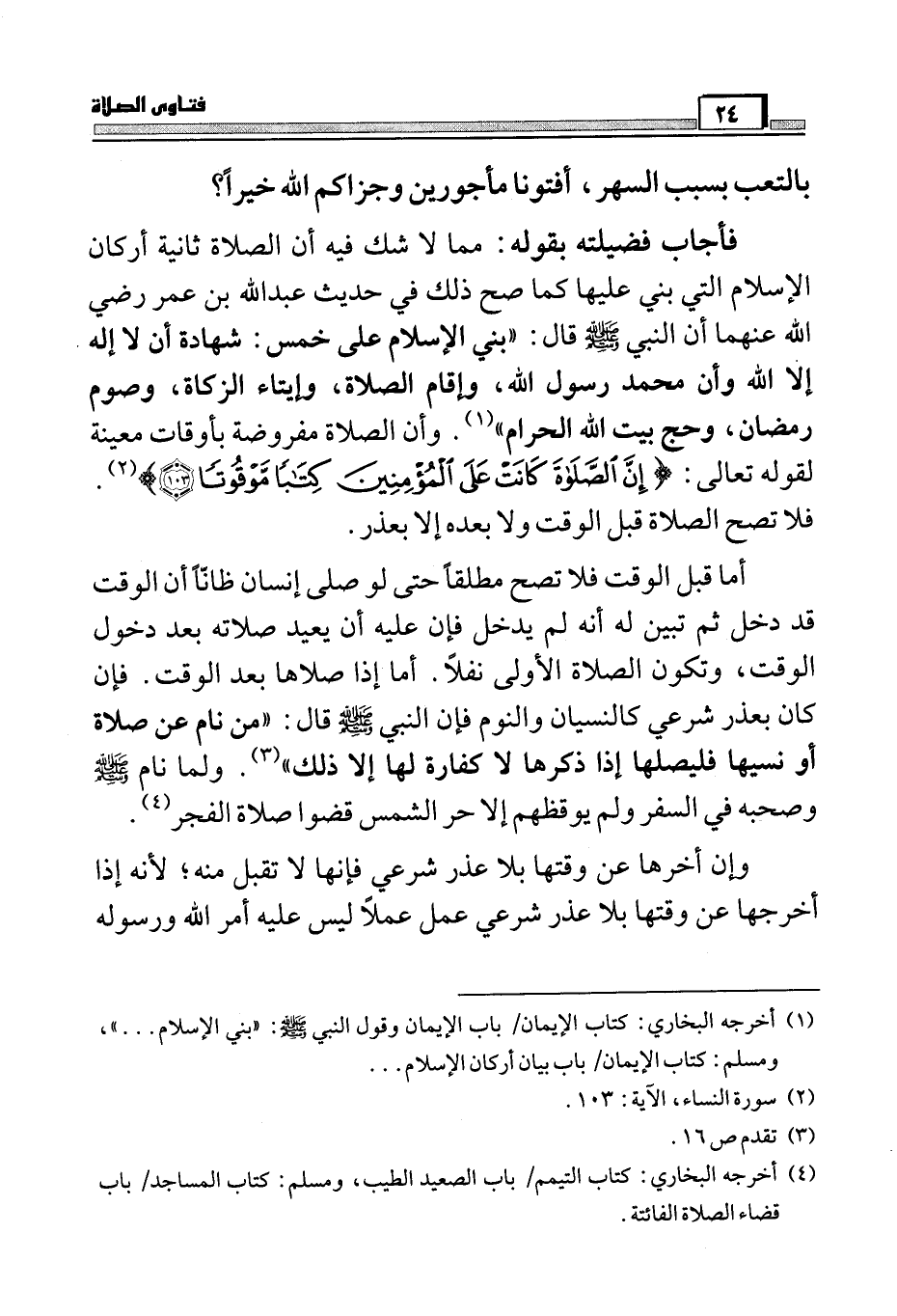 فأجاب فضيلته بقوله: مما لا شك فيه أن الصلاة ثانية أركان الإسلام التي بني عليها كما صح ذلك في حديث عبد الله بن عمر رضي الله عنهما أن النبي صَلَّى اللَّهُ عَلَيْهِ وَسَلَّمَ قال: "بني الإسلام على خمس: شهادة أن لا إله إلا الله وأن محمد رسول الله، وأقام الصلاة، وإيتاء الزكاة، وصوم رمضان، وحج بيت الله الحرام " (¬1) . وأن الصلاة مفروضة بأوقات معينة لقوله تعالى: (إِنَّ الصَّلاةَ كَانَتْ عَلَى الْمُؤْمِنِينَ كِتَاباً مَوْقُوتاً) (¬2) فلا تصح الصلاة قبل الوقت ولا بعده إلا بعذر.