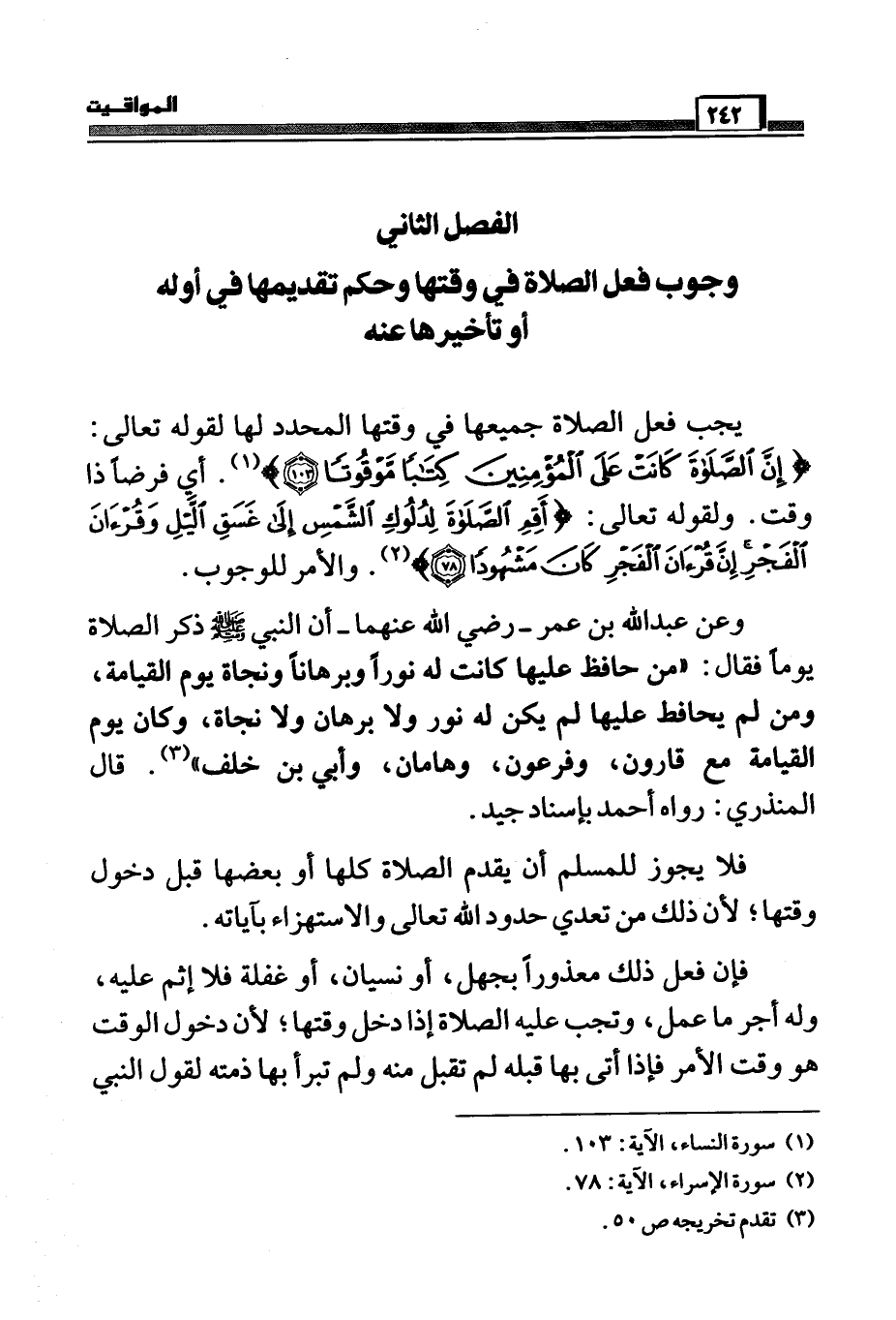 يجب فعل الصلاة جميعها في وقتها المحدد لها لقوله تعالى: (إِنَّ الصَّلاةَ كَانَتْ عَلَى الْمُؤْمِنِينَ كِتَاباً مَوْقُوتاً) (:103) (¬1) .أي فرضاً ذا وقت. ولقوله تعالي " (أَقِمِ الصَّلاةَ لِدُلُوكِ الشَّمْسِ إِلَى غَسَقِ اللَّيْلِ وَقُرْآنَ الْفَجْرِ إِنَّ قُرْآنَ الْفَجْرِ كَانَ مَشْهُوداً) (78) . (¬2) . والأمر للوجوب.