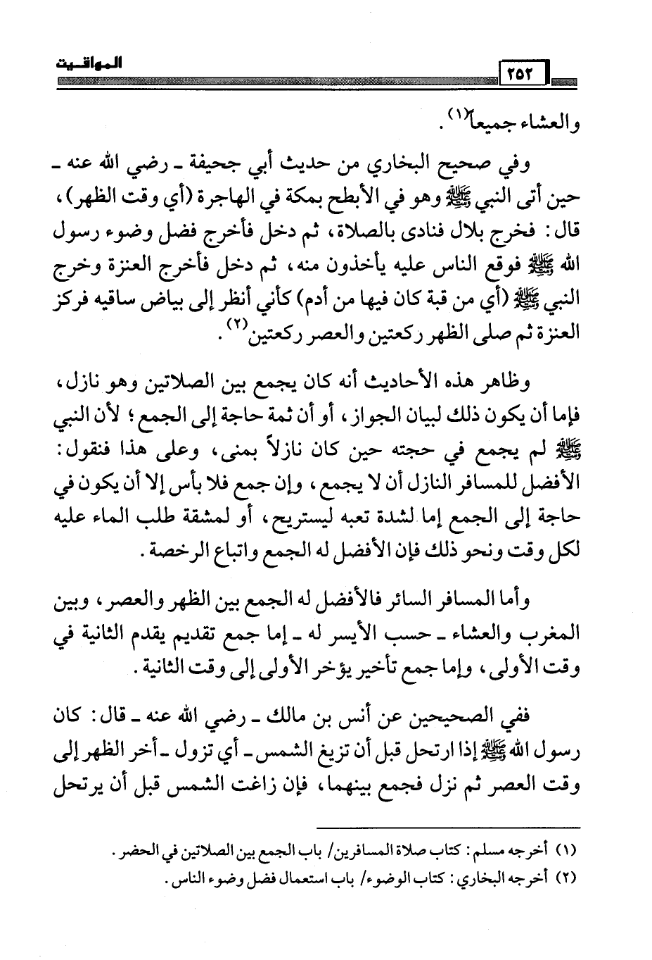 وظاهر هذه الأحاديث أنه كان يجمع بين الصلاتين وهو نازل، فإما أن يكون ذلك لبيان الجواز، أو أن ثمة حاجة إلي الجمع، لأن النبي صلي الله عليه وسلم لم يجمع في حجته حين كان نازلاً بمنى، وعلى هذا فنقول: الأفضل للمسافر النازل أن لا يجمع، وأن جمع فلا بأس إلا أن يكون في حاجة إلي الجمع إما لشدة تعبه ليستريح، أو لمشقة طلب الماء عليه لكل وقت ونحو ذلك فإن الأفضل له الجمع واتباع الرخصة.