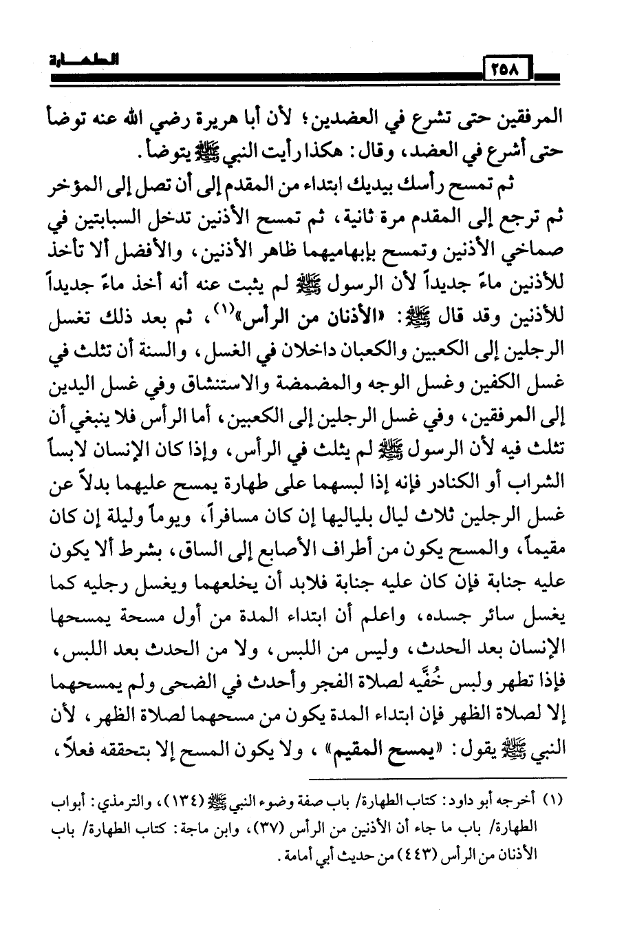 ثم بعد ذلك تغسل الرجلين إلي الكعبين والكعبان داخلان في الغسل، والسنة أن تثلث في غسل الكفين وغسل الوجه والمضمضة والاستنشاق وفي غسل اليدين إلي المرفقين، وفي غسل الرجلين إلي الكعبين، أما الرأس فلا ينبغي أن تثلث فيه لأن الرسول صلي الله عليه وسلم لم يثلث في الرأس، وإذا كان الإنسان لابساً الشراب أو الكنادر فإنه إذا لبسهما على طهارة يمسح عليهما بدلاً عن غسل الرجلين ثلاث ليال بلياليها إن كان مسافراً، ويوماً وليلة إن كان مقيماً، والمسح يكون من أطراف الأصابع إلي الساق، بشرط ألا يكون عليه جنابة فإن كان عليه جنابة فلابد أن يخلعهما ويغسل رجليه كما يغسل سائر جسده، واعلم أن ابتداء المدة من أول مسحة يمسحها الإنسان بعد الحدث، وليس من اللبس، ولا من الحدث بعد اللبس، فإذا تطهر ولبس خفيه لصلاة الفجر وأحدث في الضحى ولم يمسحهما إلا لصلاة الظهر فإن ابتداء المدة يكون من مسحهما لصلاة الظهر، لأن النبي صلي الله عليه وسلم يقول: " يمسح المقيم "، ويكون المسح إلا بتحققه فعلاً،