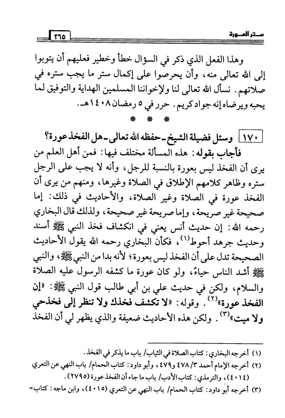 170) وسئل فضيلة الشيخ:- حفظه الله تعالى - هل الفخذ عورة؟
