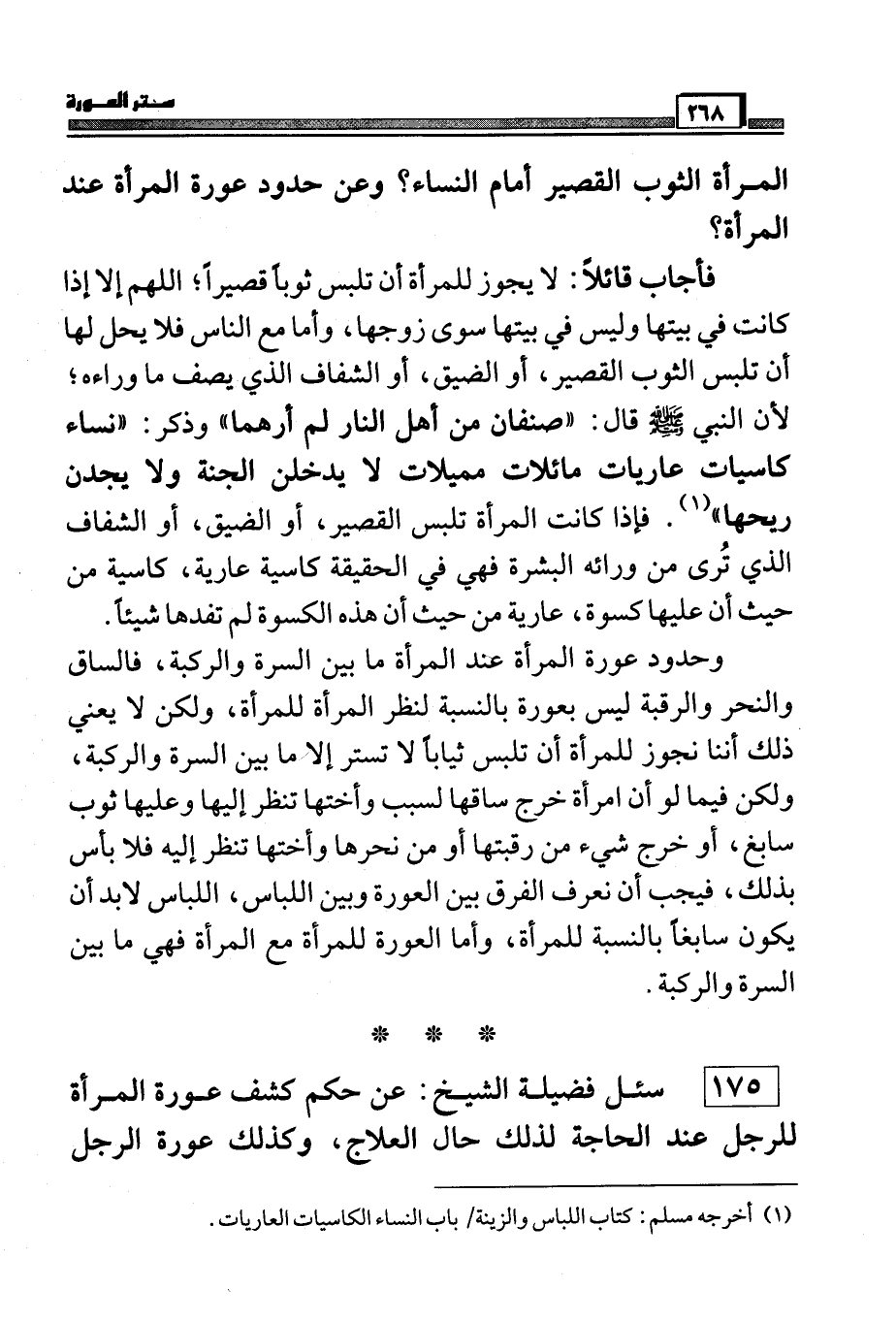 175 وسئل فضيلة الشيخ:- عن حكم كشف عورة المرأة للرجل عند الحاجة لذلك حال العلاج، وكذلك عورة الرجل