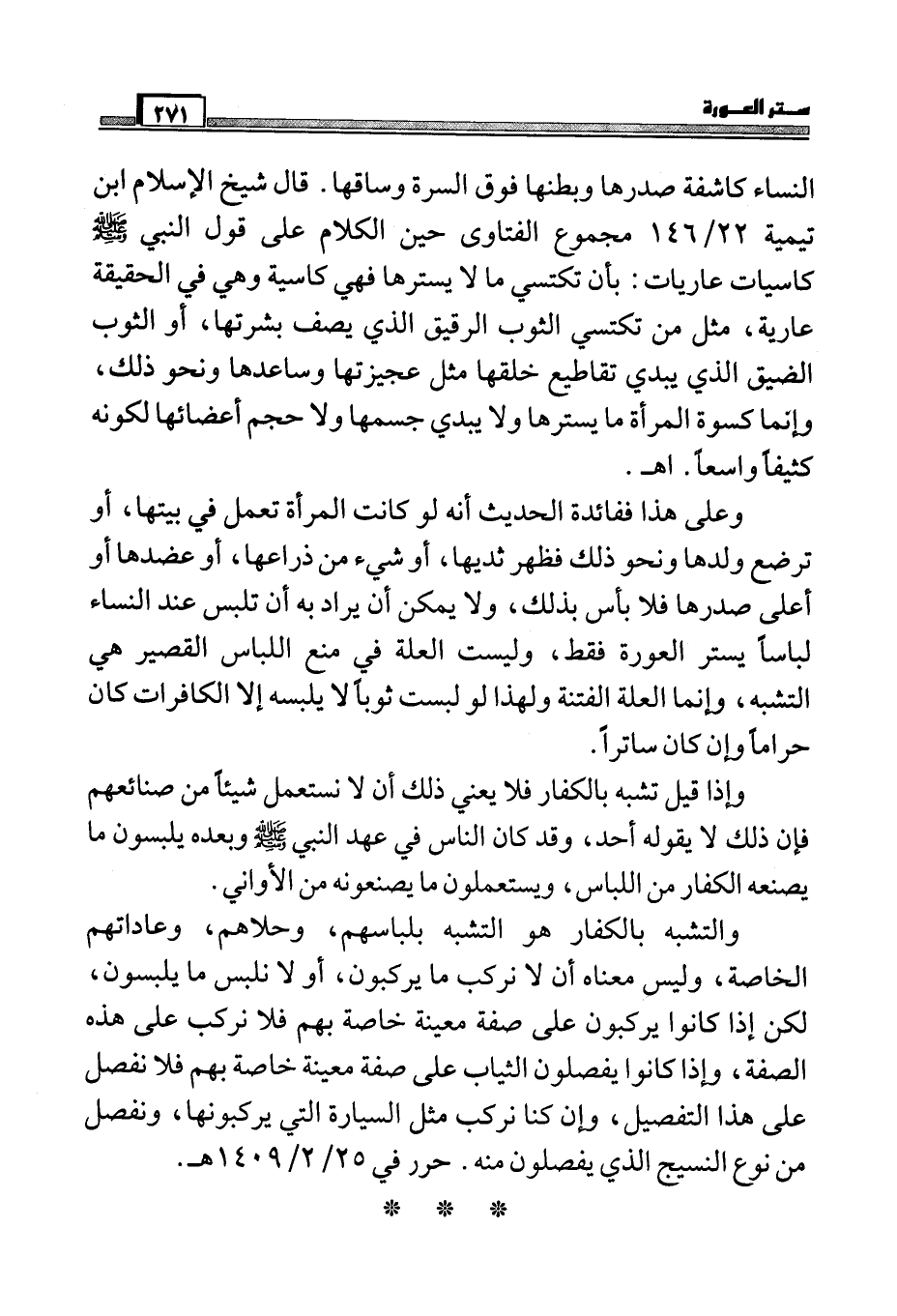 النساء كاشفة صدرها وبطنها فوق السرة وساقها. قال شيخ الإسلام ابن تيمية 22/146 مجموع الفتاوى حين الكلام على قول النبي صلي الله عليه وسلم كاسيات عاريات: بأن تكتسي ما لا يسترها فهي كاسية وهي في الحقيقة عارية، مثل من تكتسي الثوب الرقيق الذي يصف بشرتها، أو الثوب الضيق الذي يبدي تقاطيع خلقها مثل عجيزتها وساعدها ونحو ذلك، وإنما كسوة المرأة ما يسترها ولا يبدي جسمها ولا حجم أعضائها لكونه كثيفاً واسعاً. اهـ.