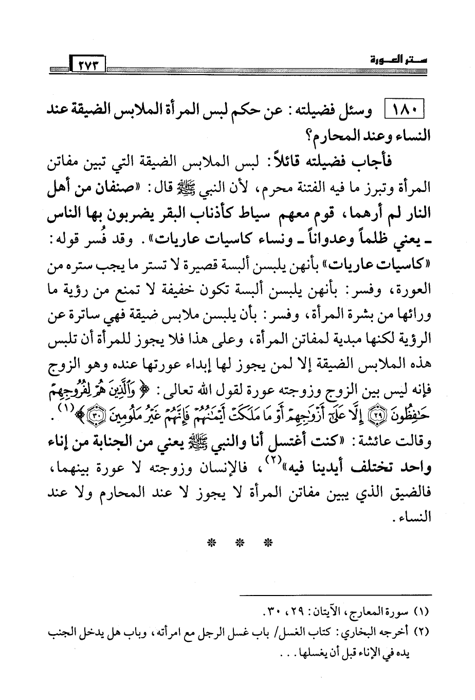 180 وسئل فضيلته: عن حكم لبس المرأة الملابس الضيقة فعند النساء وعند المحارم؟