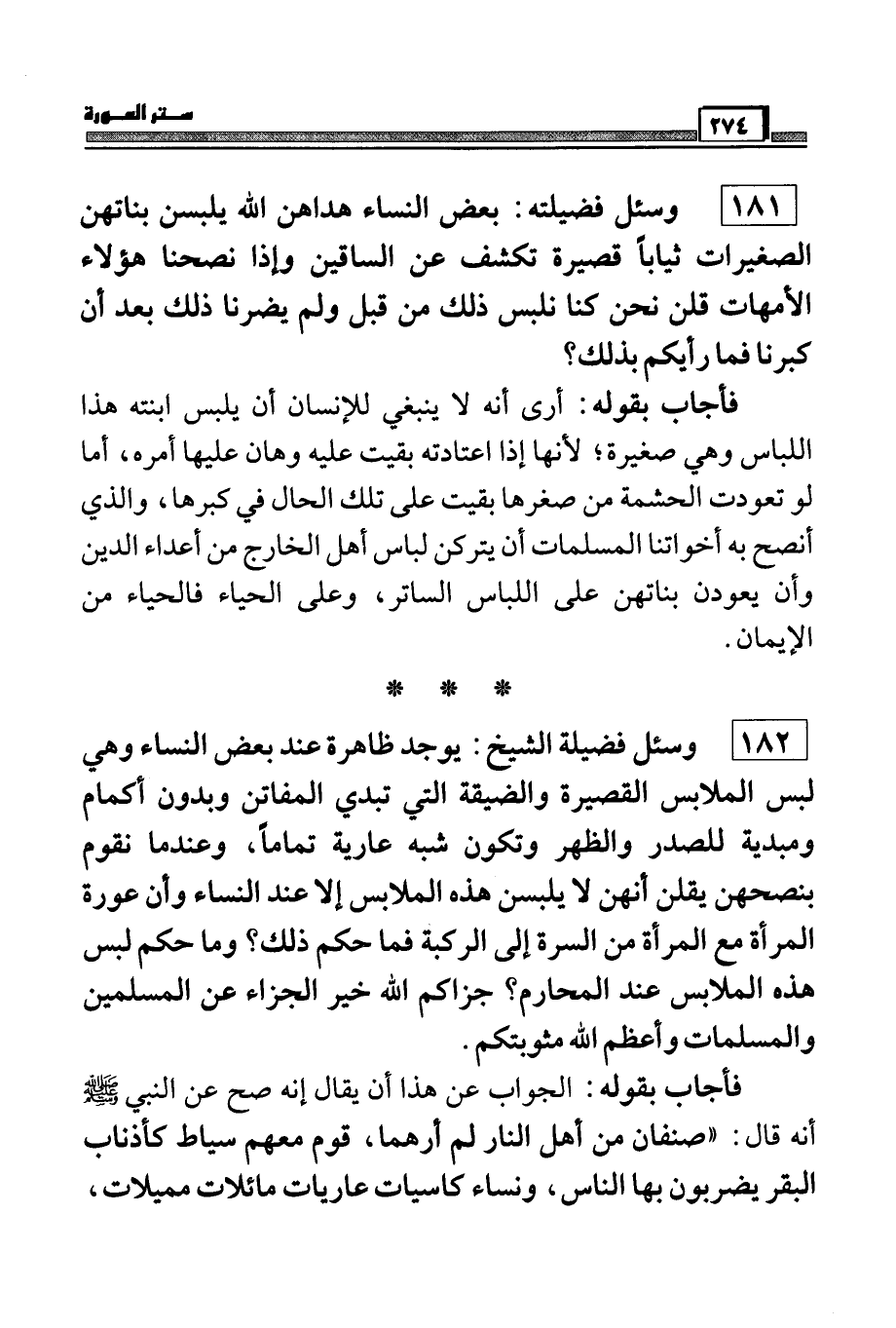 182 وسئل فضيلة الشيخ: يوجد ظاهرة عن بعض النساء وهي لبس الملابس القصيرة والضيقة التي تبدي المفاتن وبدون أكمام ومبدية للصدر والظهر وتكون شبه عارية تماماً، وعندما نقوم بنصحهن يقلن أنهن لا يلبسن هذه الملابس إلا عند النساء وأن عورة المرأة مع المرأة من السرة إلى الركبة فما حكم ذلك؟ وما حكم لبس هذه الملابس عند المحارم؟ جزاكم الله خير الجزاء عن المسلمين والمسلمات وأعظم الله مثوبتكم؟