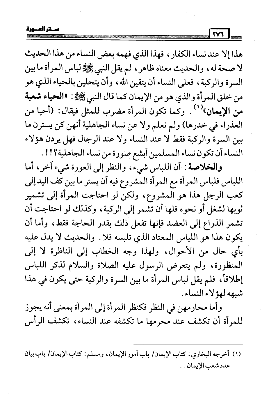 هذا إلا عند نساء الكفار، فهذا الذي فهمه بعض النساء من هذا الحديث لا صحة له، والحديث معناه ظاهر، لم يقل النبي صَلَّى اللَّهُ عَلَيْهِ وَسَلَّمَ لباس المرأة ما بين السرة والركبة، لعلى النساء أن يتقين الله، وأن يتحلين بالحاء الذي هو من خلق المرأة والذي هو من الإيمان كما قال النبي صَلَّى اللَّهُ عَلَيْهِ وَسَلَّمَ: ((الحياء شعبة من الإيمان)) (¬1) .