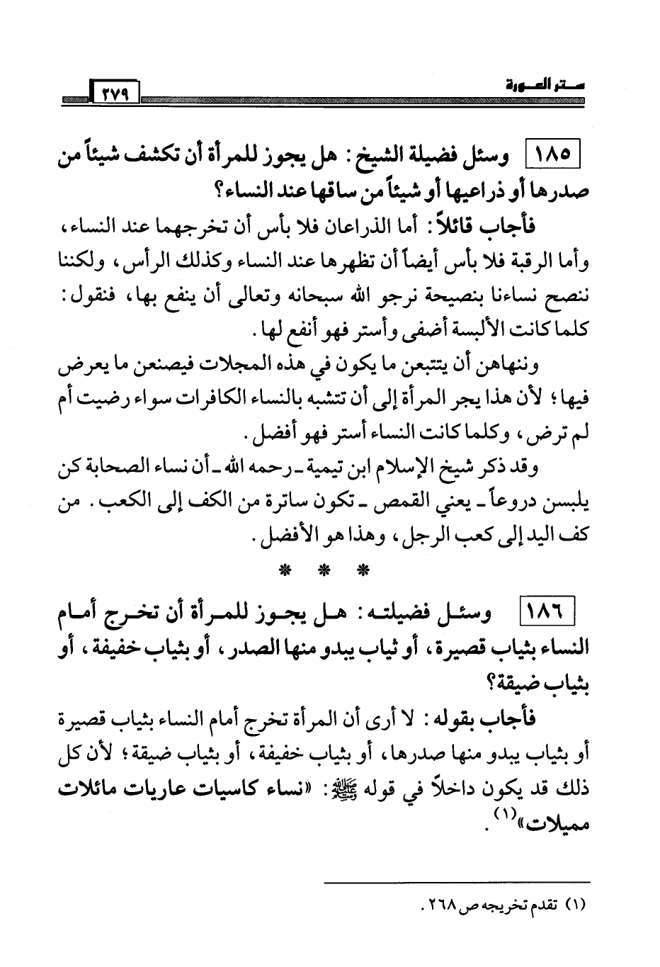 186) وسئل فضيلته: هل يجوز للمرأة أن تخرج أمام النساء بثياب قصيرة، أو ثياب يبدو منها الصدر، أو بثياب خفيفة، أو بثياب ضيقة؟