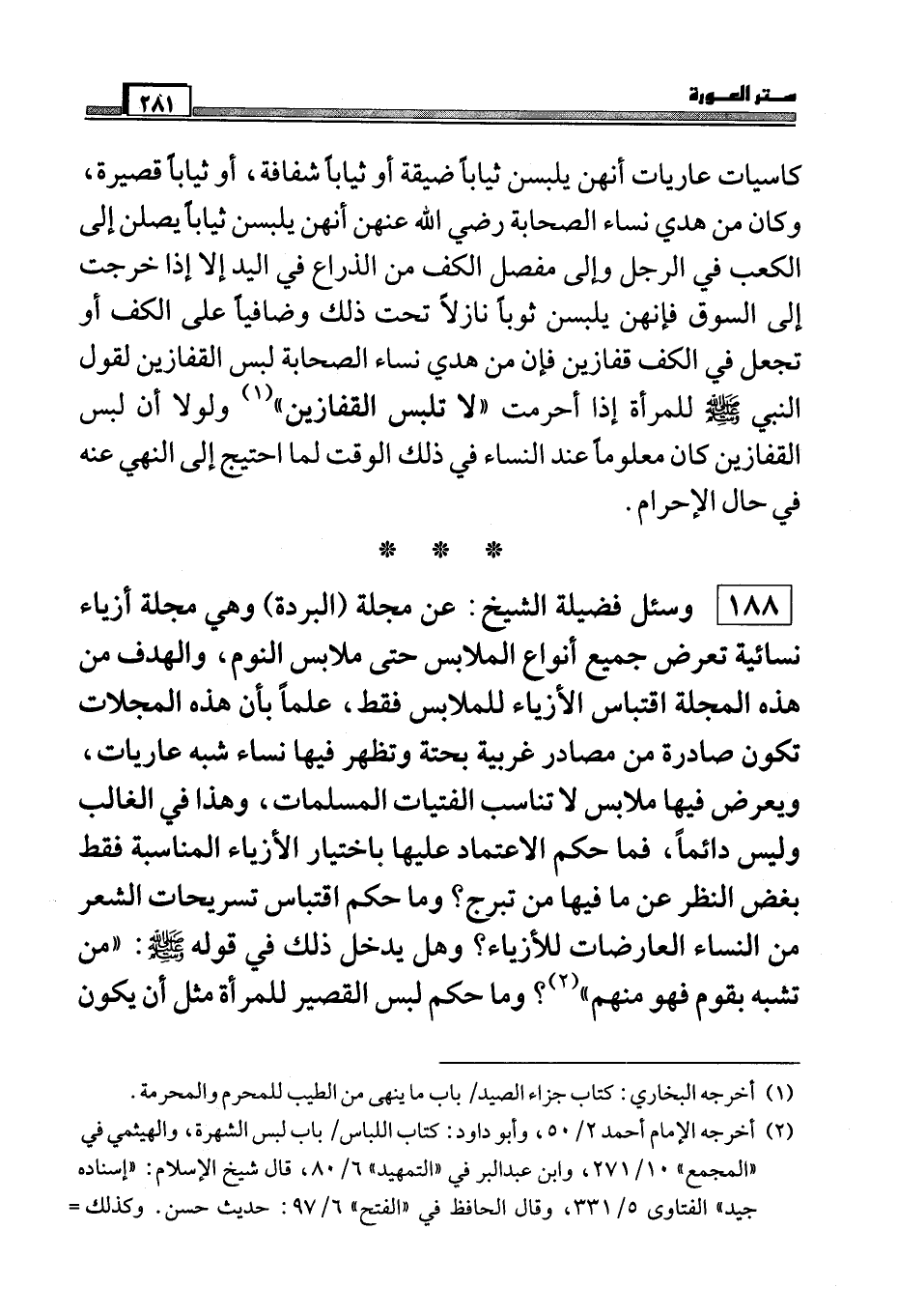 188) وسئل فضيلة الشيخ: عن مجلة (البردة) وهي مجلة أزياء نسائية تعرض جميع أنواع الملابس حتى ملابس النوم، والهدف من هذه المجلة اقتباس الأزياء للملابس لقط ن علماً بأن هذه المجلات تكون صادرة من مصادر غربية بحتة وتظهر فيها نساء شبه عاريات، ويعرض فيها ملابس لا تناسب الفتيات المسلمات، وهذا في الغالب وليس دائماً، فما حكم الاعتماد عليها باختيار الأزياء المناسبة فقط بغض النظر عن ما فيها من تبرج؟ وما حكم اقتباس تسريحات الشعر من النساء العارضات للأزياء؟ وهل يدخل ذلكم في قوله صَلَّى اللَّهُ عَلَيْهِ وَسَلَّمَ ((من تشبه بقوم فهو منهم)) (¬2) وما حكم لبس القصير للمرأة مثل أن يكون
