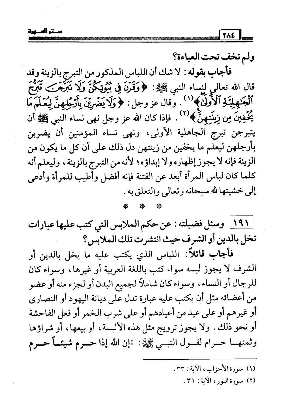 فأجاب بقوله: لا شك أن اللباس المذكور من التبرج بالزينة وقد قال الله تعالى لنساء النبي صَلَّى اللَّهُ عَلَيْهِ وَسَلَّمَ (وَقَرْنَ فِي بُيُوتِكُنَّ وَلا تَبَرَّجْنَ تَبَرُّجَ الْجَاهِلِيَّةِ الْأُولَى) (¬1) . وقال عز وجل (وَلا يَضْرِبْنَ بِأَرْجُلِهِنَّ لِيُعْلَمَ مَا يُخْفِينَ مِنْ زِينَتِهِنَّ) (¬2) . فإذا كان الله عز وجل نهى نساء النبي صَلَّى اللَّهُ عَلَيْهِ وَسَلَّمَ أن يتبرجن تبرج الجاهلية الأولى، ونهى نساء المؤمنين أن يضربن بأرجلهن ليعلم ما يخفين من زينتهن دل ذلك على أن كل ما يكون من الزينة فإنه لا يجوز إظهاره ولا إبداؤه، لأنه من التبرج بالزينة، وليعلم أنه كلما كان لباس المرأة أبعد عن الفتنة فإنه أفضل وأطيب للمرأة وأدعى إلى خشيتها لله سبحانه وتعالى والتعلق به.
