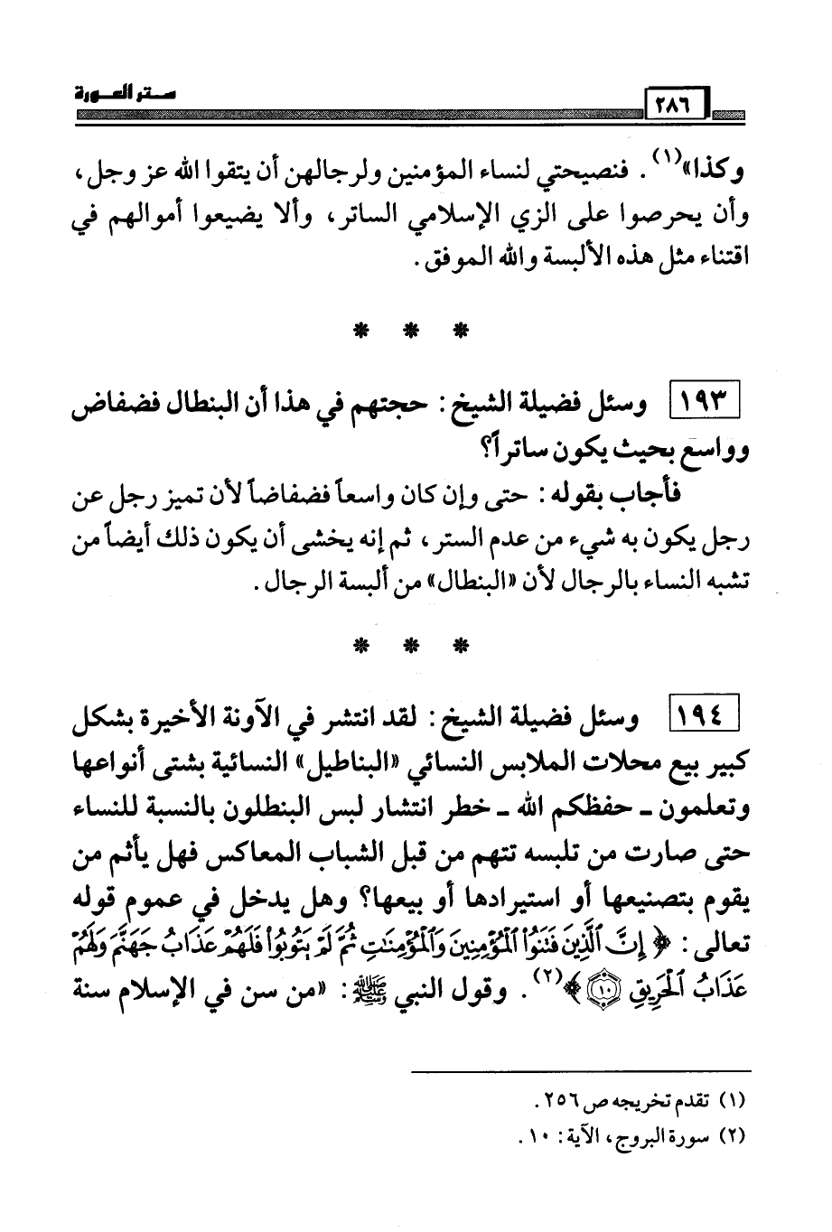 194) وسئل فضيلة الشيخ: لقد انتشر في الآونة الأخيرة بشكل كبير بيع محلات الملابس النسائي ((البناطيل)) النسائية بشتى أنواعها وتعلمون - حفظكم الله - خطر انتشار لبس البنطلون بالنسبة للنساء حتى صارت من تلبسه تتهم من قبل الشباب المعاكس فهل يأثم من يقوم بتصنيعها أو استيرادها أو بيعها؟ وهل يدخل في عموم قوله تعالى (إِنَّ الَّذِينَ فَتَنُوا الْمُؤْمِنِينَ وَالْمُؤْمِنَاتِ ثُمَّ لَمْ يَتُوبُوا فَلَهُمْ عَذَابُ جَهَنَّمَ وَلَهُمْ عَذَابُ الْحَرِيقِ) (¬2) . وقول النبي صَلَّى اللَّهُ عَلَيْهِ وَسَلَّمَ ((نم سن في الإسلام سنة