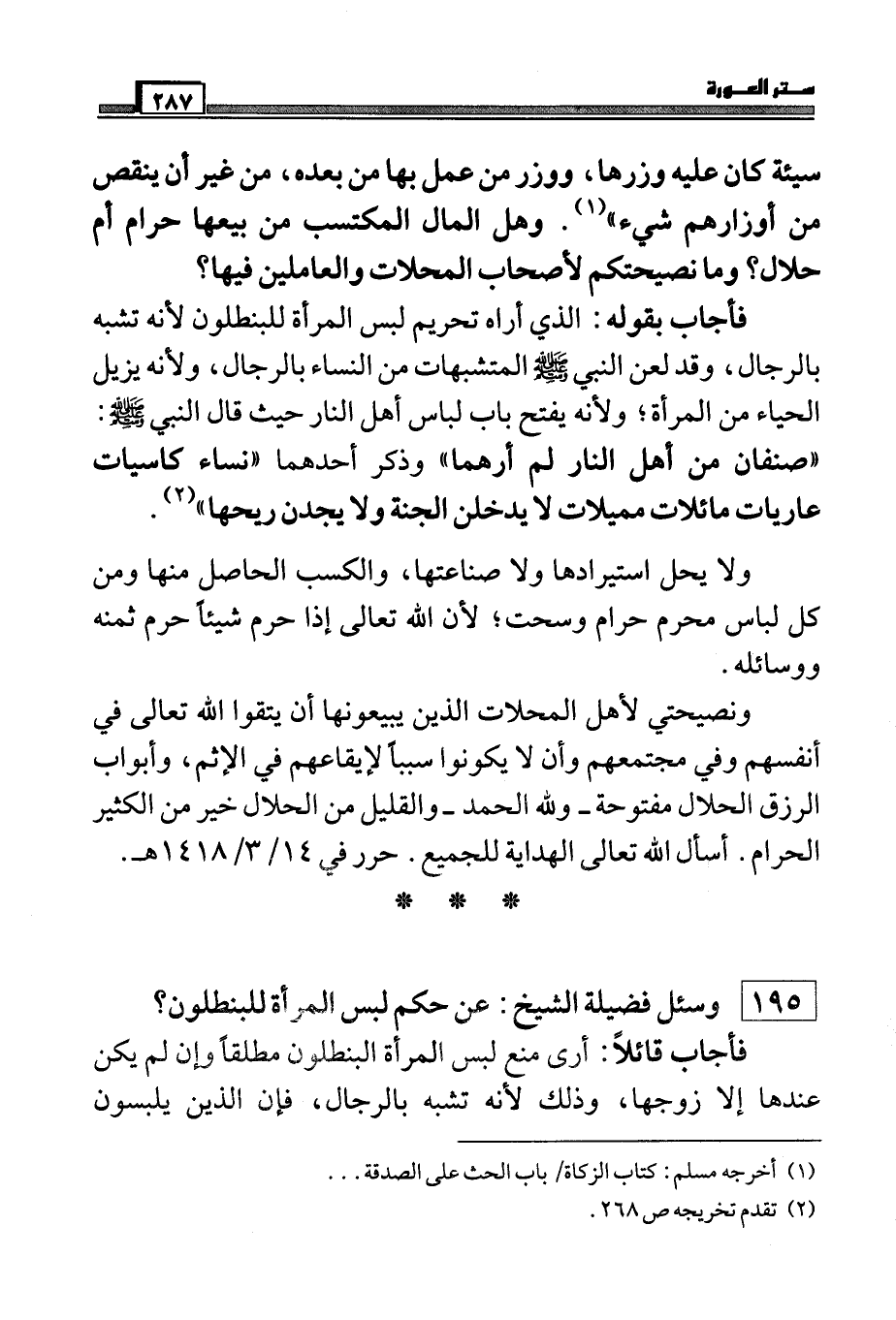 فأجاب بقوله: الذي أراه تحريم لبس المرأة للبنطلون لأنه تشبه بالرجال، وقد لعن النبي صَلَّى اللَّهُ عَلَيْهِ وَسَلَّمَ المتشبهات من النساء بالرجال، ولأنه يزيل الحياء من المرأة، ولأنه يفتح باب لباس أهل النار حيث قال النبي صَلَّى اللَّهُ عَلَيْهِ وَسَلَّمَ ((صنفان من أهل النار لم أرهما)) وذكر أحدهما ((نساء كاسيات عاريات مائلات مميلات رؤسهن كأسنمة البخت المائلة لا يدخلن الجنة ولا يجدن ريحها)) (¬2) .