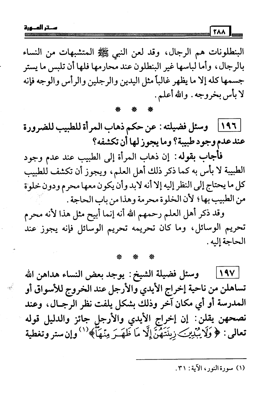 196) وسئل فضيلته: عن حكم ذهاب المرأة للطبيب للضرورة عند عدم وجود طبيبة؟ وما يجوز لها أن تكشفه؟
