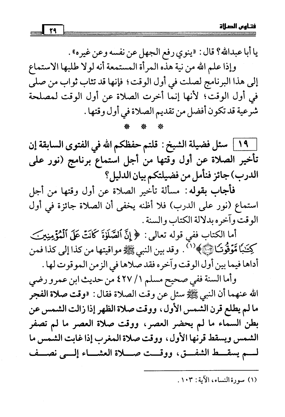 19) سئل فضيلة الشيخ: قلتم حفظكم الله في الفتوى السابقة إن تأخير الصلاة عن أول وقتها من أجل استماع برنامج (نور علي الدرب) جائز فنأمل من فضيلتكم بيان الدليل؟