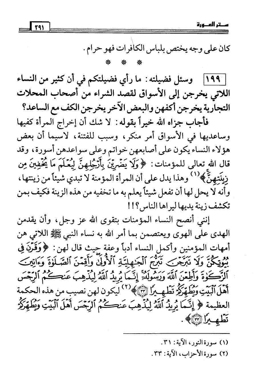199) وسئل فضيلته: ما رأي فضيلتكم في أن كثير من النساء اللاتي يخرجن إلى الأسواق لقصد الشراء من أصحاب المحلات التجارية يخرجن أكفهن، والبعض الأخر يخرجن الكف من الساعد؟