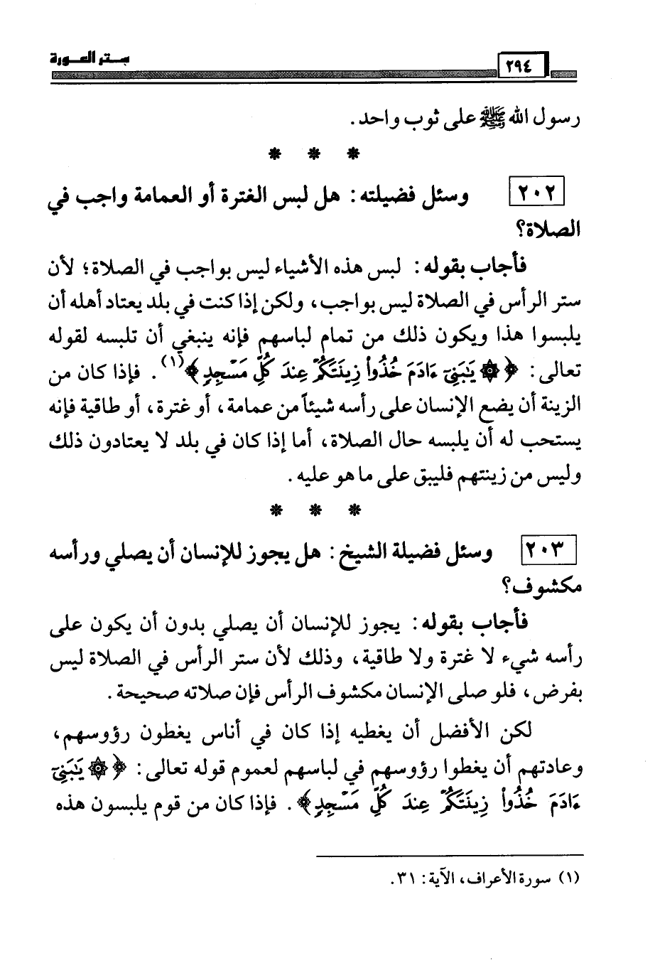 فأجاب بقوله: لبس هذه الأشياء ليس بواجب في الصلاة، لأن ستر الرأس في الصلاة ليس بواجب، ولكن إذا كنت في بلد يعتاد أهله أن يلبسوا هذا ويكون ذلك من تمام لباسهم فإنه ينبغي أن تلبسه لقوله تعالى (يَا بَنِي آدَمَ خُذُوا زِينَتَكُمْ عِنْدَ كُلِّ مَسْجِدٍ) (¬1) .