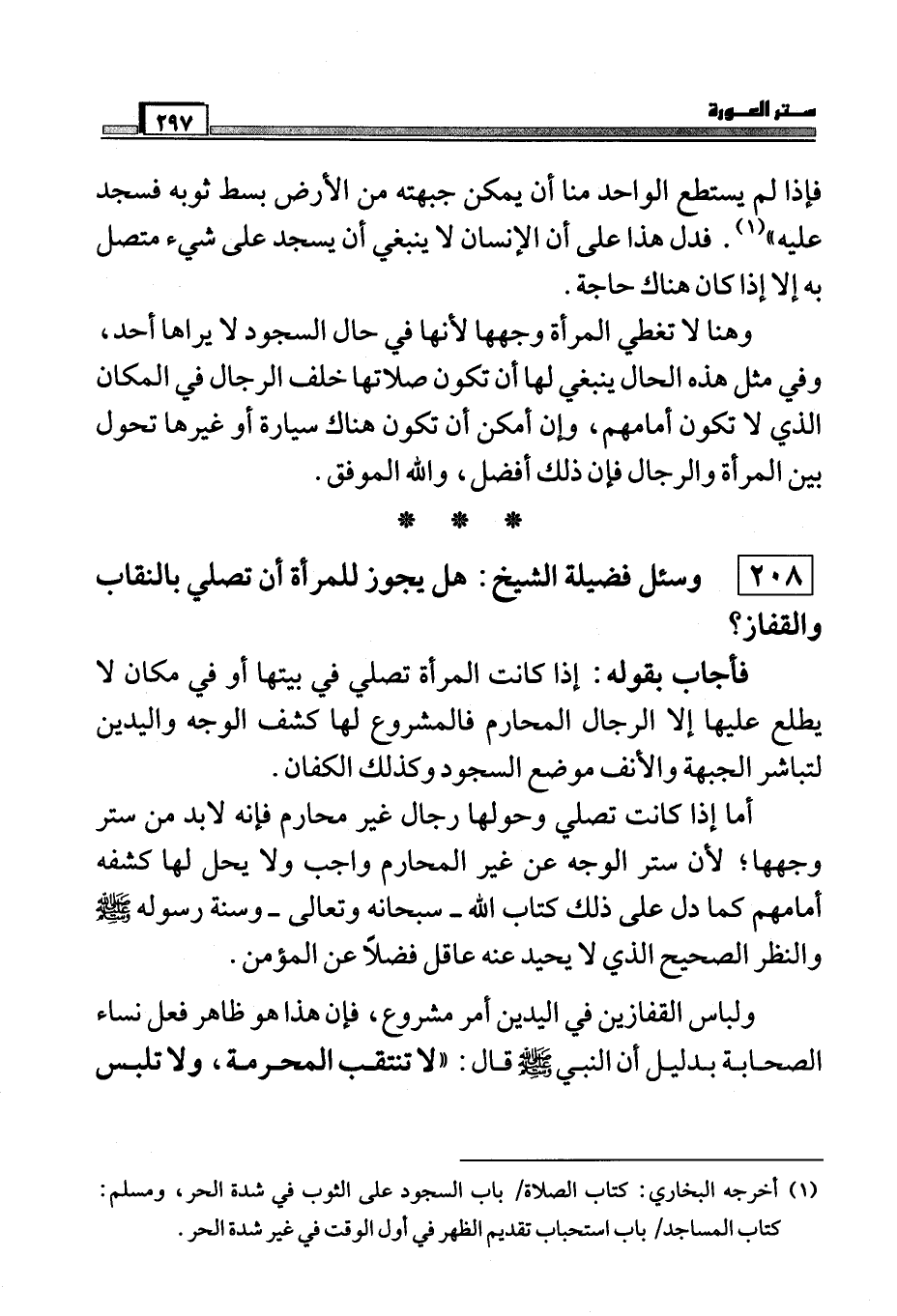 فأجاب بقوله: إذا كانت المرأة تصلي في بيتها أو في مكان لا يطلع عليها إلا الرجال المحارم فالمشروع لها كشف الوجه واليدين لتباشر الجبهة والنف موضع السجود وكذلك الكفان.