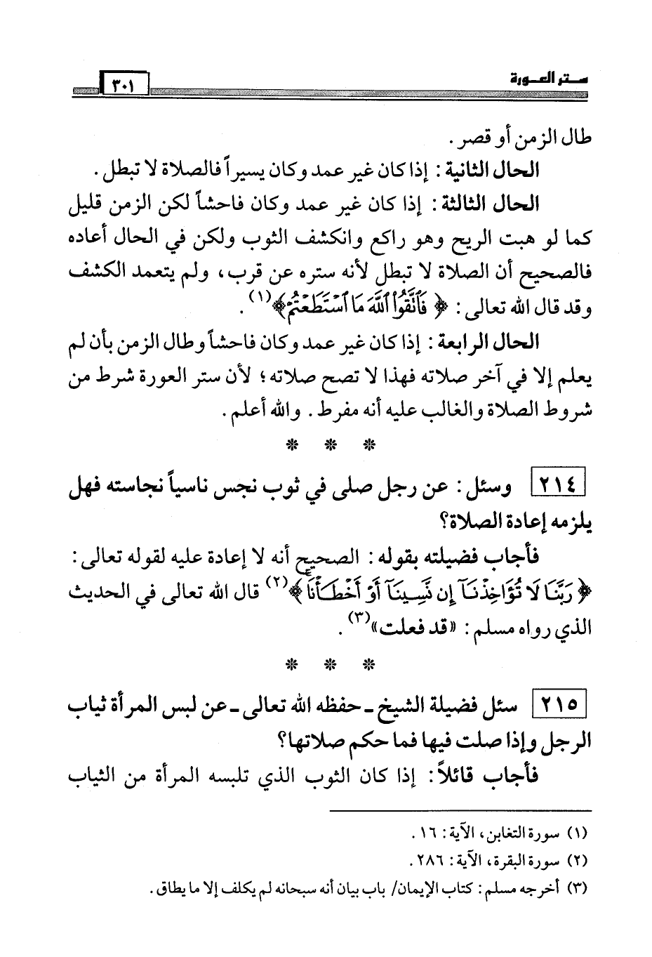 فأجاب فضيلته بقوله: الصحيح أنه لا إعادة عليه لقوله تعالى: (رَبَّنَا لا تُؤَاخِذْنَا إِنْ نَسِينَا أَوْ أَخْطَأْنَا) (¬2) قال الله تعالى في الحديث الذي رواه مسلم: ((قد فعلت)) (¬3) .