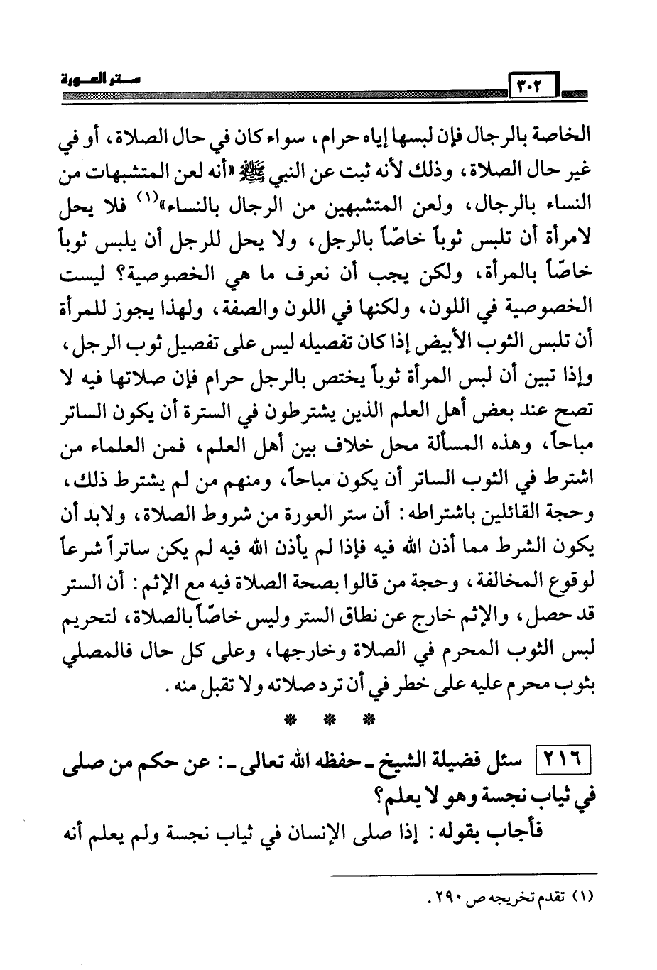 الخاصة بالرجال فإن لبسها إياه حرام، سواء كان ي حال الصلاة، أو ي غير حال الصلاة، وذلك لأنه ثبت عن النبي صَلَّى اللَّهُ عَلَيْهِ وَسَلَّمَ ((أنه لعن المتشبهات من النساء بالرجال، ولعن المتشبهين من الرجال بالنساء)) (¬1) فلا يحل لامرأة أن تلبس ثوباً خاصاً بالرجل، ولا يحل للرجل أن يلبس ثوباً خاصاً بالمرأة، ولكن يجب أن نعرف ما هل الخصوصية؟ ليست الخصوصية في اللون، ولكنها لي اللون والصفة، ولهذا يجوز للمرأة أن تلبي الثوب الأبيض إذا كان تفصيله ليس على تفصيل ثوب الرجل، وإذا تبين أن لبس المرأة ثوباً يختص بالرجل حرام فإن صلاتها فيه لا تصح عند بعض أهل العلم الذين يشترطون في السترة أن يكون الساتر مباحاً، وهذه المسألة محل خلاف بين أهل العلم، فمن العلماء من اشترط في الثوب الساتر أن يكون مباحاً، ومنهم من لم يشترط ذلك، وحجة القائلين باشتراطه: أن ستر العورة من شروط الصلاة، ولابد أن يكون الشرط مما أذن الله فيه فإذن لم يأذن الله فيه لم يكن ساتراً شرعاً لوقوع المخالفة، وحجة من قالوا بصحة الصلاة فيه مع الإثم: أن الستر قد حصل، والإثم خارج عن نطاق الستر وليس خاصاً بالصلاة، لتحريم لبس الثوب المحرم في الصلاة وخارجها، وعلى كل حال فالمصلي بثوب محرم عليه على خطر في أن ترد صلاته ولا تقبل منه.