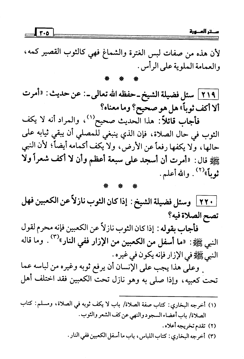 فأجاب قائلاً: هذا الحديث صحيح (¬1) ، والمراد أنه لا يكف الثوب في حال الصلاة، فإن الذي ينبغي للمصلي أن يبقي ثيابه على حالها، ولا يكفها رفعاً عن الأرض، ولا يكف أكمامه أيضاً، لأن النبي صلي الله عليه وسلم قال: " أمرت أن أسجد على سبعة أعظم وأن لا أكف شعراً ولا ثوباً " (¬2) . والله أعلم.