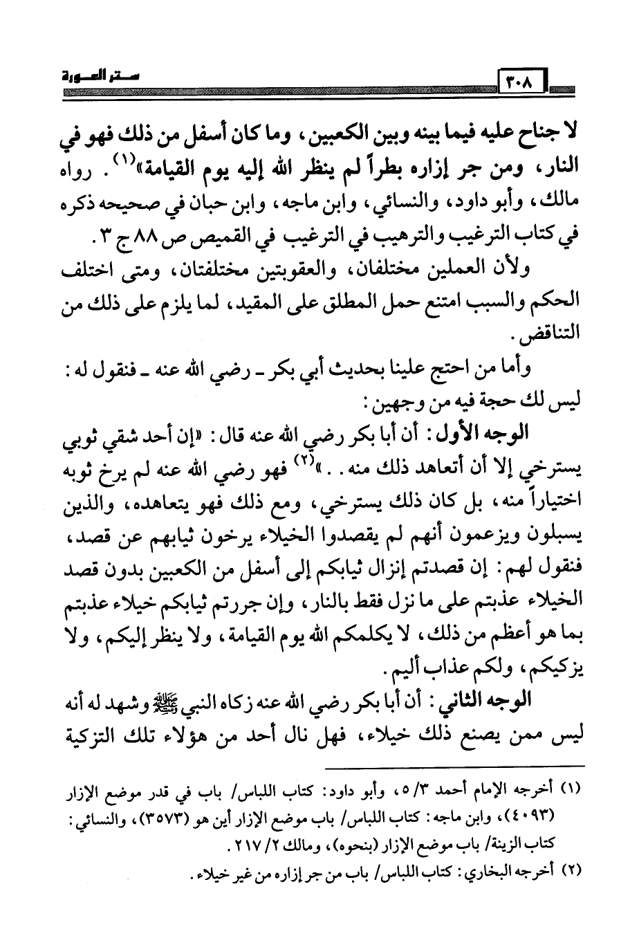 الوجه الأول: أن أبا بكر رضى الله عنه قال: ((إن أحد شقي ثوبي يسترخي إلا أن أتعاهد ذلك منه..)) (¬2) فهو رضى الله عنه لم يرخ ثوبه اختياراً منه، بل كان ذلك يسترخي، ومع ذلك فهو يتعاهده، والذين يسبلون ويزعمون أنهم لم يقصدوا الخيلاء يرخون ثيابهم عن قصد، فنقول لهم: إن قدتم إنزال ثيابكم إلى أسفل من الكعبين بدون قصد الخيلاء عذبتم على ما نزل فقط بالنار، وإن جررتم ثيابكم خيلاء عذبتم بما هو أعظم من ذلكم، لا يكلمكم الله يوم القيامة، ولا ينظر إليكم، ولا يزكيكم، ولكم عذاب أليم.