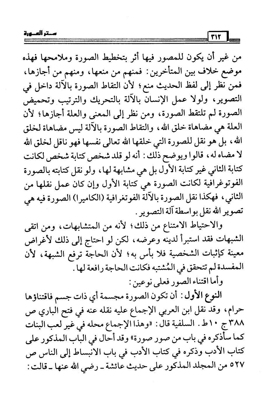 النوع الأول: أن تكون الصورة مجسمة أي ذات جسم فاقتناؤها حرام، وقد نقل ابن العربي الإجماع عليه نقله عنه في فتح الباري ص 388 ج 10ط. السلفية قال: ((وهذا الإجماع محله في غير لعب البنات كما سأذكره في باب من صور صورة)) وقد أحال في الباب المذكور على كتاب الأدب وذكره في كتاب الأدب في باب الانبساط إلى الناس ص 527 من المجلد المذكور على حديث عائشة – رضى الله عنها – قالت: