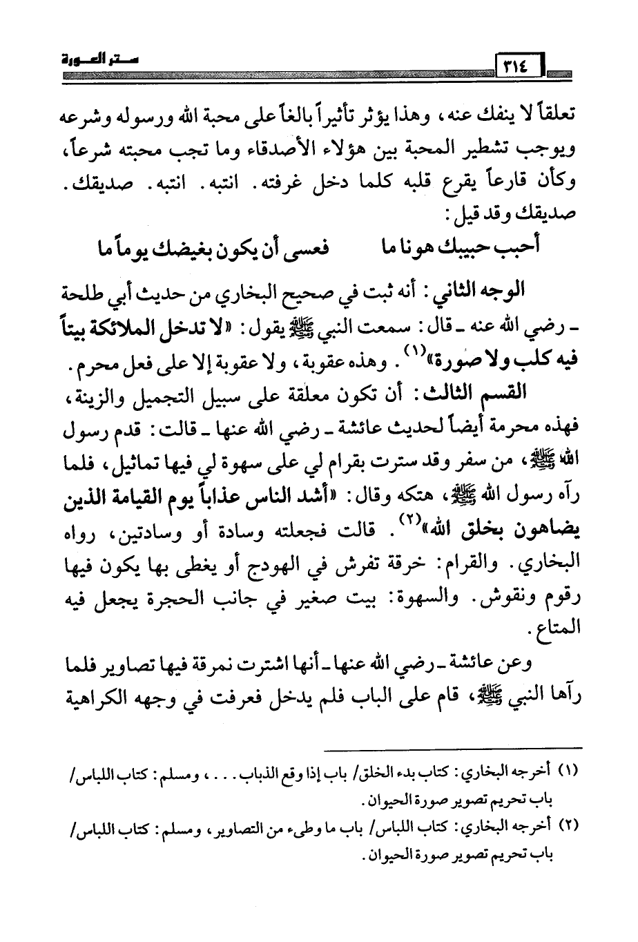 القسم الثالث: أن تكون معلقة على سبيل التجميل والزينة، فهذه محرمة أيضاً لحديث عائشة – رضى الله عنها – قالت: قدم رسول الله صَلَّى اللَّهُ عَلَيْهِ وَسَلَّمَ هتكه وقال: ((أشد الناس عذاباً يوم القيامة الذين يضاهون بخلق الله)) (¬2) . قالت فجعلته وسادة أو وسادتين، رواه البخاري. والقرام / خرقة تفرش في الهودج أو يغطى بها يكون فيها رقوم ونقوش. والسهوة: بيت صغير في جانب الحجرة يجعل فيه المتاع.