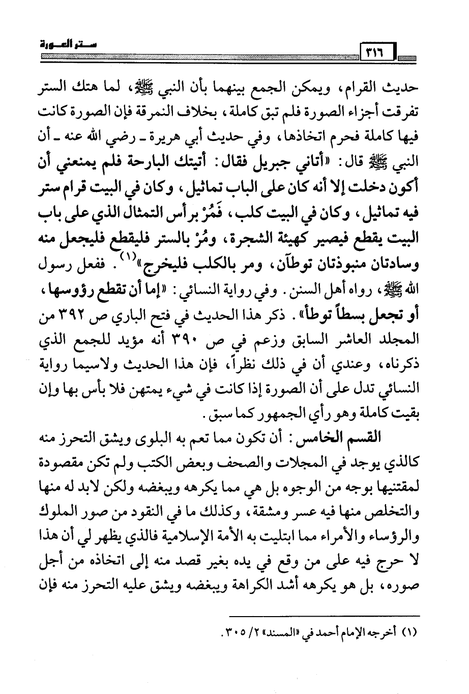 القسم الخامس: أن تكون مما تعم به البلوى ويشق التحرز منه كالذي يوجد في المجلات والصحف وبعض الكتب ولم تكن مقصودة لمقتنيها بوجه من الوجوه بل هي مما يكرهه ويبغضه ولكن لابد له منها والتخلص منها فيه عسر ومشقة، وكذلك ما في النقود من صور الملوك والرؤساء والأمراء ممال ابتليت به الأمة الإسلامية فالذي يظهر لي أن هذا لا حرج فيه على من وقع في يده بغير قصد منه إلى اتخاذه من أجل صوره، بل هو يكرهه أشد الكراهة ويبغضه ويشق عليه التحرز منه فإن