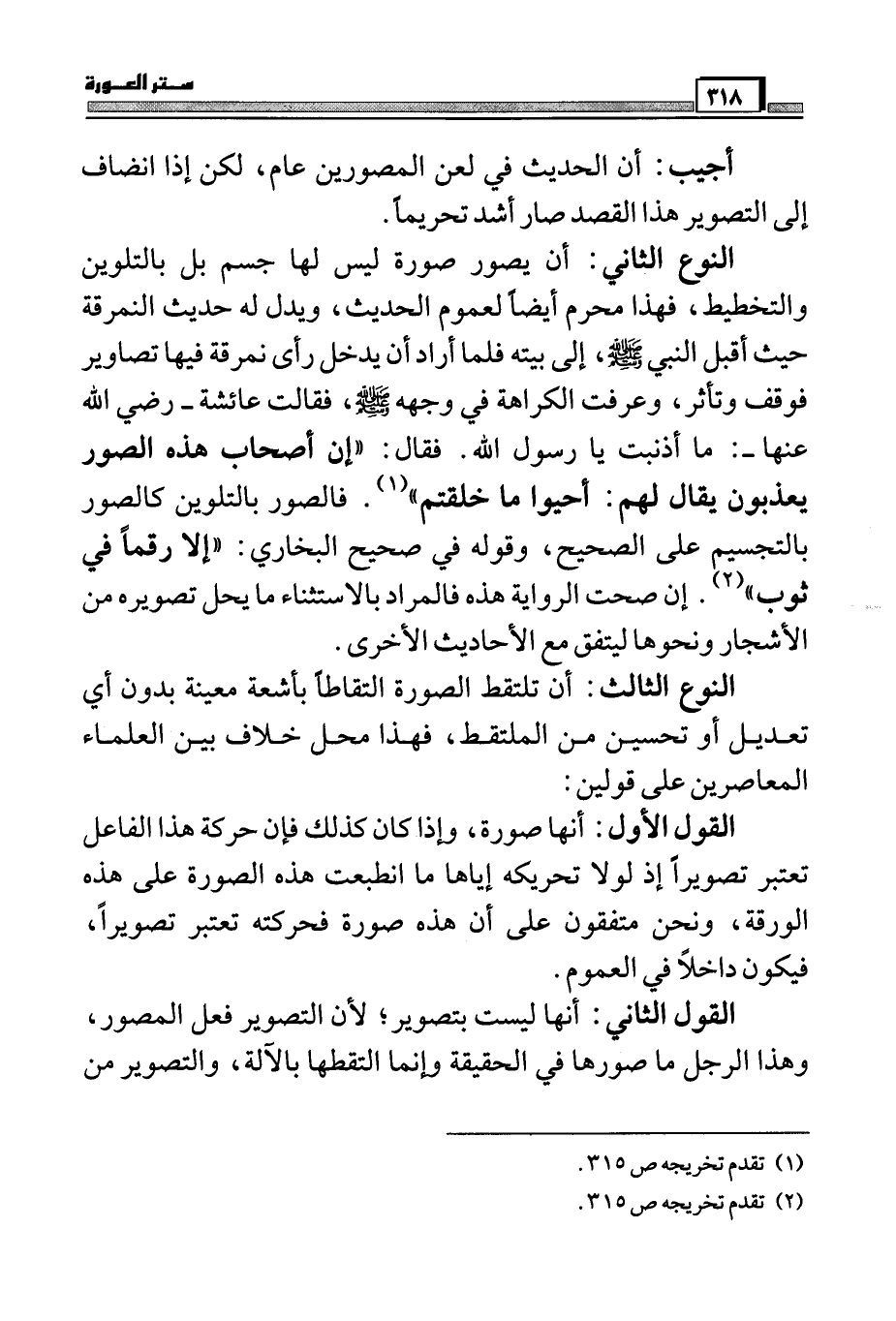 النوع الثاني: أن يصور صورة ليس لها جسم بل بالتلوين والتخطيط، فهذا محرم أيضاً لعموم الحديث، ويدل له حديث النمرقة حيث أقبل النبي صَلَّى اللَّهُ عَلَيْهِ وَسَلَّمَ إلى بيته فلما أراد أن يدخل رأي نمرقة فيها تصاوير فوقف وتأثر، وعرفت الكارهة في وجهه صَلَّى اللَّهُ عَلَيْهِ وَسَلَّمَ فقالت عائشة – رضى الله عنها -: ما أذنبت يا رسول الله. فقال: ((إن أصحاب هذه الصور يعذبون يقال لهم: أحيوا ما خلقتم)) (¬1) . فالصور بالتلوين كالصور بالتجسيم على الصحيح، وقوله في صحيح البخاري: ((إلا رقماً في ثوب)) (¬2) . إن صحت الرواية هذه فالمراد بالاستثناء ما يحل تصويره من الأشجار ونحوها ليتفق مع الأحاديث الأخرى.