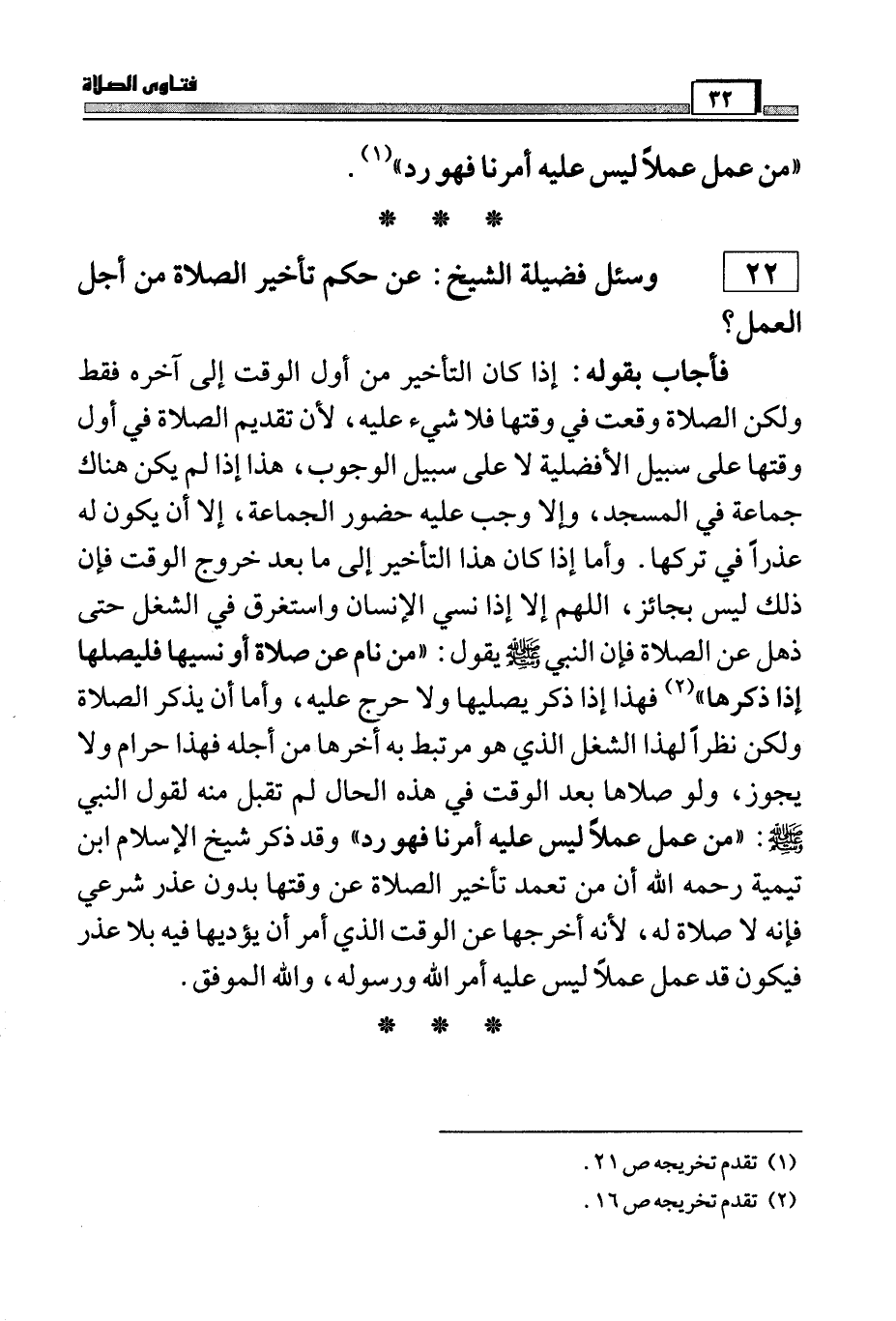 22) وسئل فضيلة الشيخ: عن حكم تأخير الصلاة من أجل العمل؟