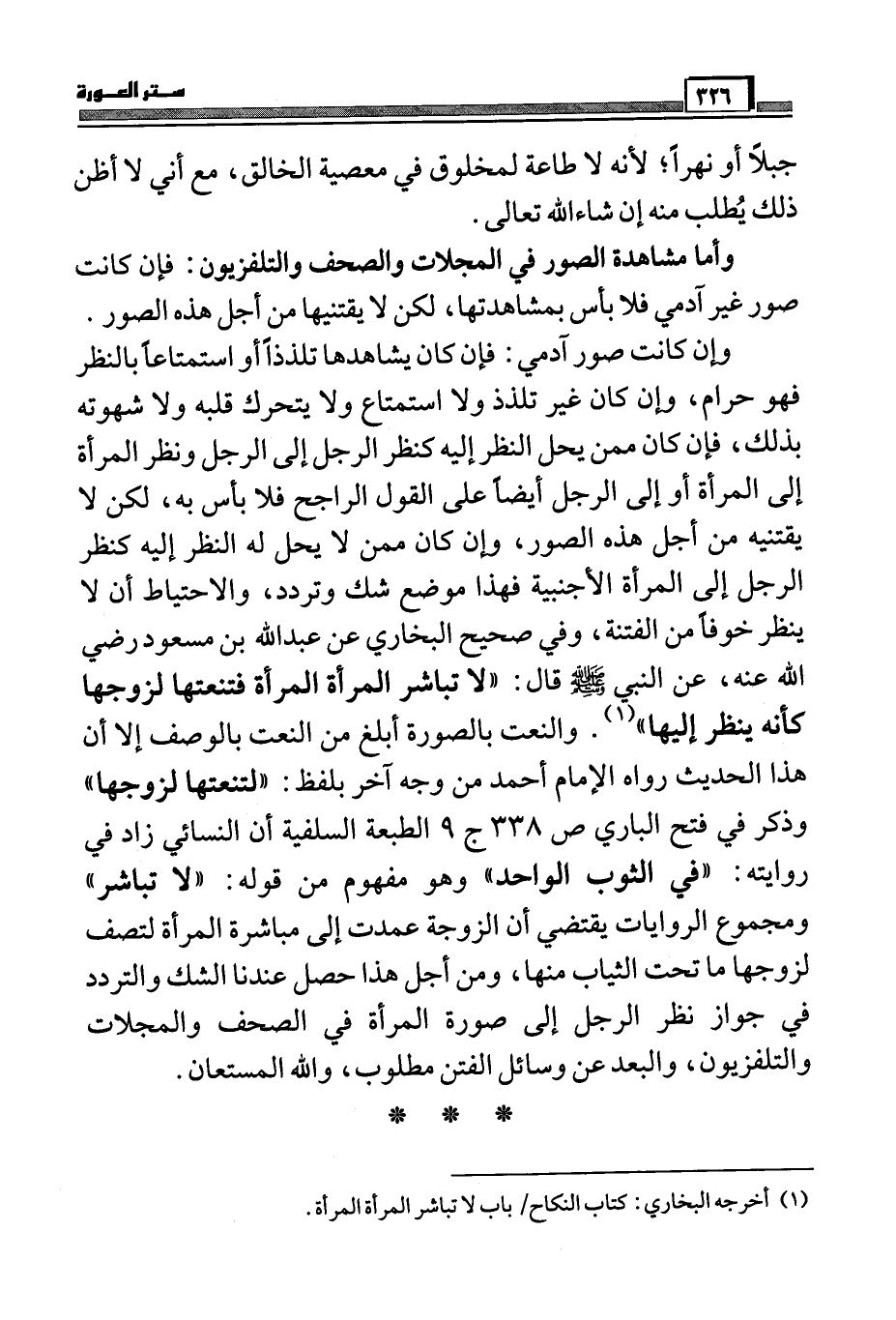 وإن كانت صور آدمي: فإن كان يشاهدها تلذذاً أو استمتاعاً بالنظر فهو حرام، وإن كان غير تلذذ ولا استمتاع ولا يتحرك قلبه ولا شهوته بذلك، فإن كان ممن يحل النظر إليه كنظر الرجل إلى الرجل ونظر المرأة إلى المرأة أو إلى الرجل أيضاً على القول الراجح فلا بأس به، لكن لا يقتنيه من أجل هذه الصور، وإن كان ممن لا يحل له النظر إليه كنظر الرجل إلى المرأة الأجنبية فهذا موضع شك وتردد، والاحتياط أن لا ينظر خوفاً من الفتنة، وفي صحيح البخاري عن عبد الله بن مسعود رضى الله عنه، عن النبي صَلَّى اللَّهُ عَلَيْهِ وَسَلَّمَ قال: ((لا تباشر المرأة المرأة فتنعتها لزوجها كأنه ينظر إليها)) (¬1) . والنعت بالصورة أبلغ من النعت بالوصف إلا أن هذا الحديث رواه الإمام أحمد من وجه آخر بلفظ: ((لتنعتها لزوجها)) وذكر في فتح الباري ص 338 ج 9 الطبعة السلفية أن النسائي زاد في روايته: ((في الثوب الواحد)) وهو مفهوم من قوله: ((لا تباشر)) ومجموع الروايات يقتضي أن الزوجة عمدت إلى مباشرة المرأة لتصف لزوجها ما تحت الثياب منها، ومن أجل هذا حصل عندنا الشك والتردد في جواز نظر الرجل إلى صورة المرأة في الصحف والمجلات والتليفزيون، والبعد عن وسائل الفتن مطلوب، والله المستعان.