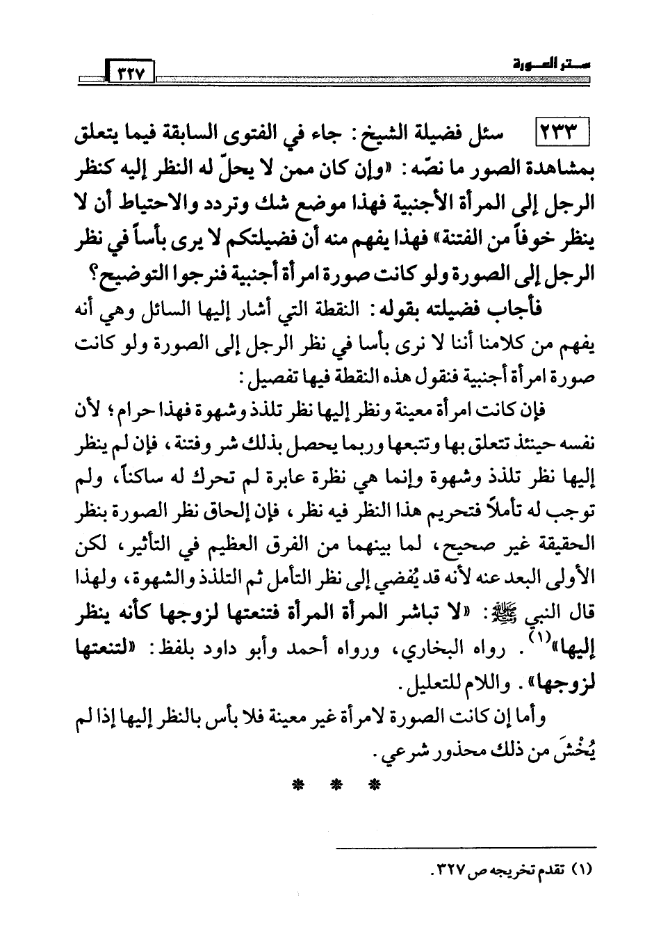 233 سئل فضيلة الشيخ: جاء في الفتوى السابقة فيما يتعلق بمشاهدة الصور ما نصه: ((وإن كان ممن لا يحل له النظر إليه كنظر الرجل إلى المرأة الأجنبية فهذا موضع شك وتردد والاحتياط أن لا ينظر خوفاً من الفتنة)) فهذا يفهم منه أن فضيلتكم لا يرى بأساً في نظر الرجل إلى الصورة ولو كانت صورة امرأة أجنبية فنرجو التوضيح؟