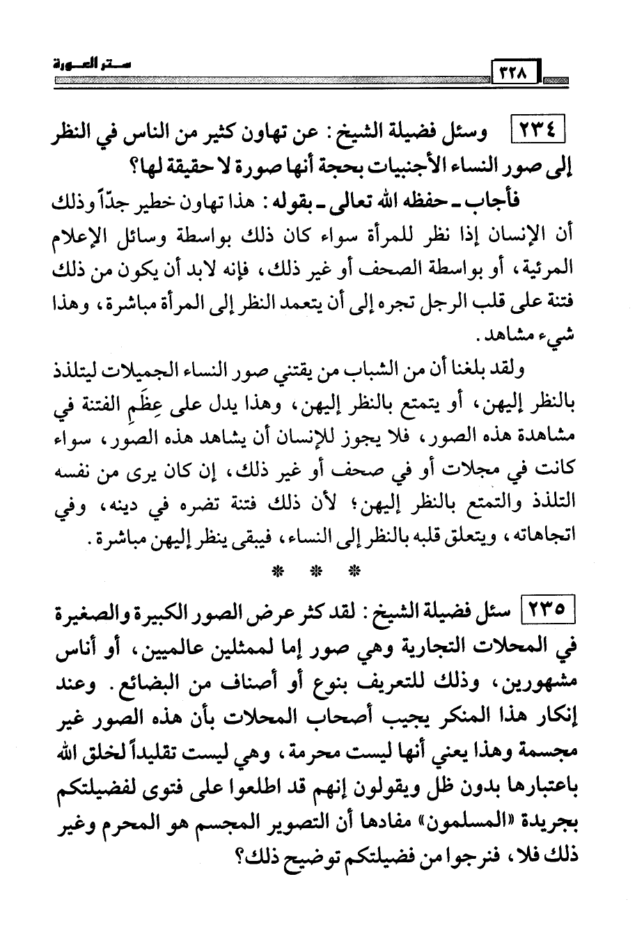 فأجاب - حفظه الله تعالى - بقوله: هذا تهاون خطير جداً وذلك أن الإنسان إذا نظر للمرأة سواء كان ذلك بوساطة وسائل الإعلام المرئية، أو بواسطة الصحف أو غر ذلك، فإنه لابد أن يكون من ذلك فتنة على قلب الرجل تجره إلى أن يتعمد النظر إلى المرأة مباشرة، وهذا شيء مشاهد.