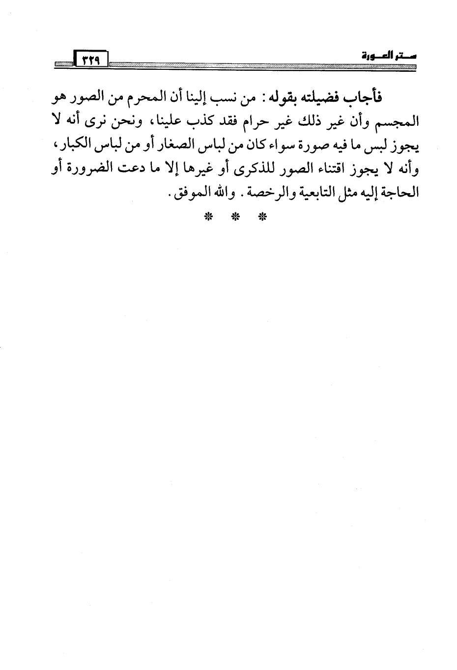 فأجاب فضيلته بقوله: من نسب إلينا أن المحرم من الصور هو المجسم وأن غير ذلك غير حرام فقد كذب علينا، ونحن نرى أنه لا يجوز لبس ما فيه صورة سواء كان من لباس الصغار أو من لباس الكبار، وأنه لا يجوز اقتناء الصور للذكرى أو غيرها إلا ما دعت الضرورة أو الحاجة إليه مثل التابعية والرخصة. والله الموفق.
