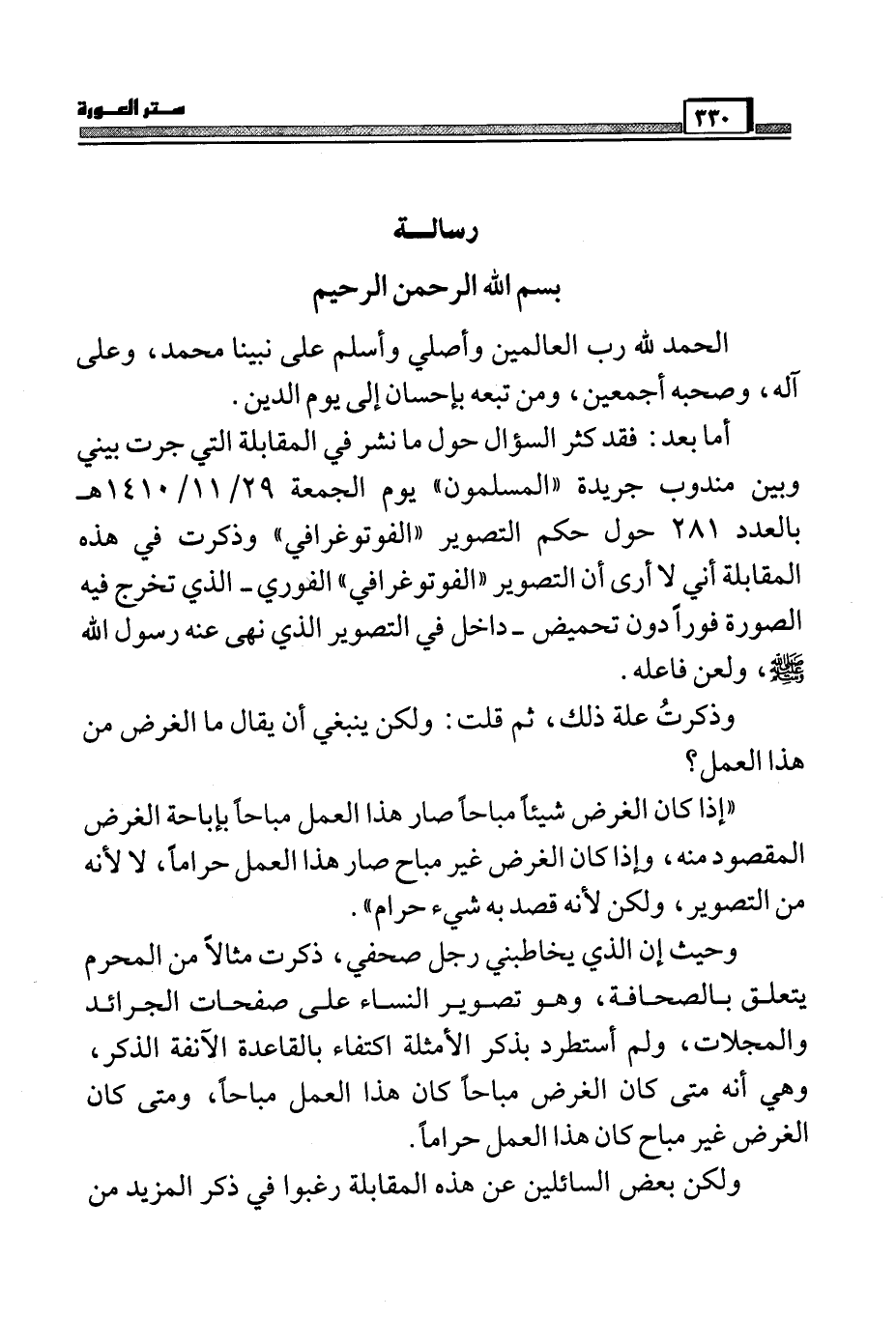 أما بعد: فقد كثر السؤال حول ما نشر في المقابلة التي جرت بين وبين مندوب جريدة " المسلمون " يوم الجمعة 29/11/1410 هـ بالعدد 281 حول حكم التصوير " الفوتوغرافي " الفوري - الذي تخرج فيه الصورة فوراً دون تحميض - دخل في التصوير الذي نهى عنه رسول الله صَلَّى اللَّهُ عَلَيْهِ وَسَلَّمَ ولعن فاعله.
