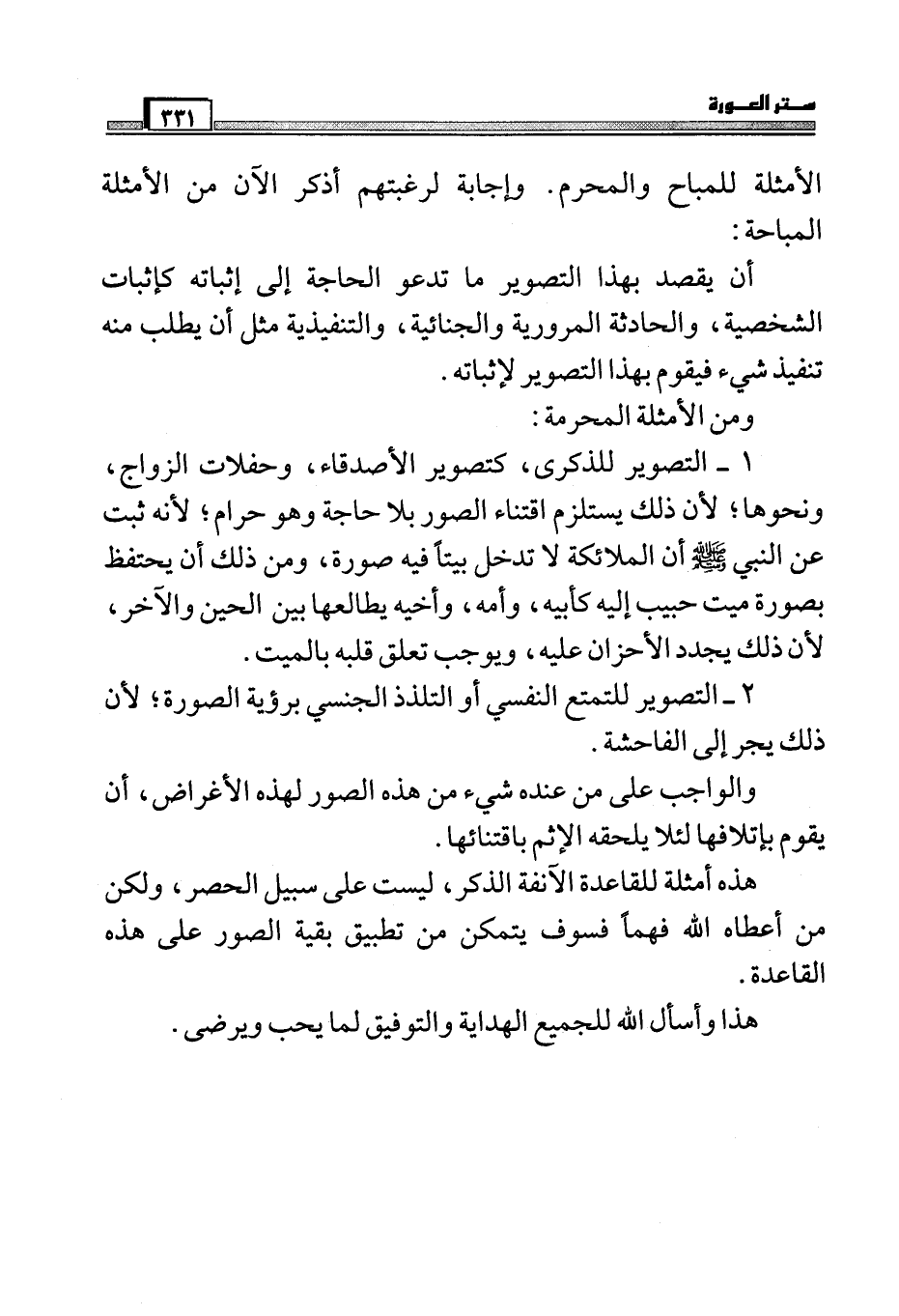1 – التصوير للذكرى، كتصوير الأصدقاء، وحفلات الزواج، ونحوها، لأن ذلك يستلزم اقتناء الصور بلا حاجة وهو حرام، لأنه ثبت عن النبي صَلَّى اللَّهُ عَلَيْهِ وَسَلَّمَ أن الملائكة لا تدخل بيتاً فيه صورة، ومن ذلك أن يحتفظ بصورة ميت حبيب إليه كأبيه، وأمه، وأخيه يطالعها بين الحين والآخر، لأن ذلك يجدد الأحزان عليه، ويوجب تعلق قلبه بالميت.