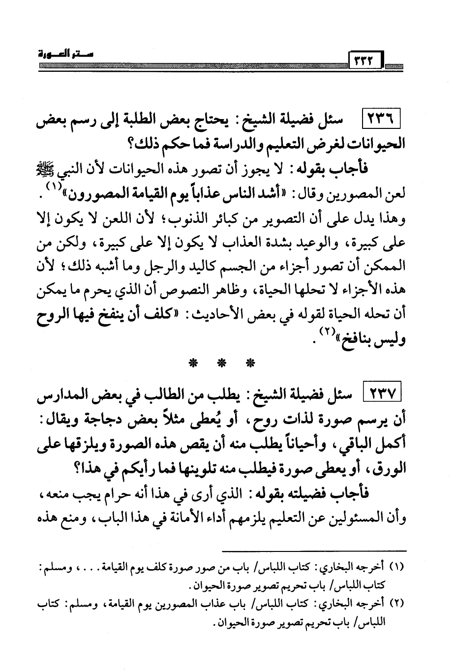 236 سئل فضيلة الشيخ: يحتاج بعض الطلبة إلى رسم بعض الحيوانات لغرض التعليم والدراسة فما حكم ذلك؟