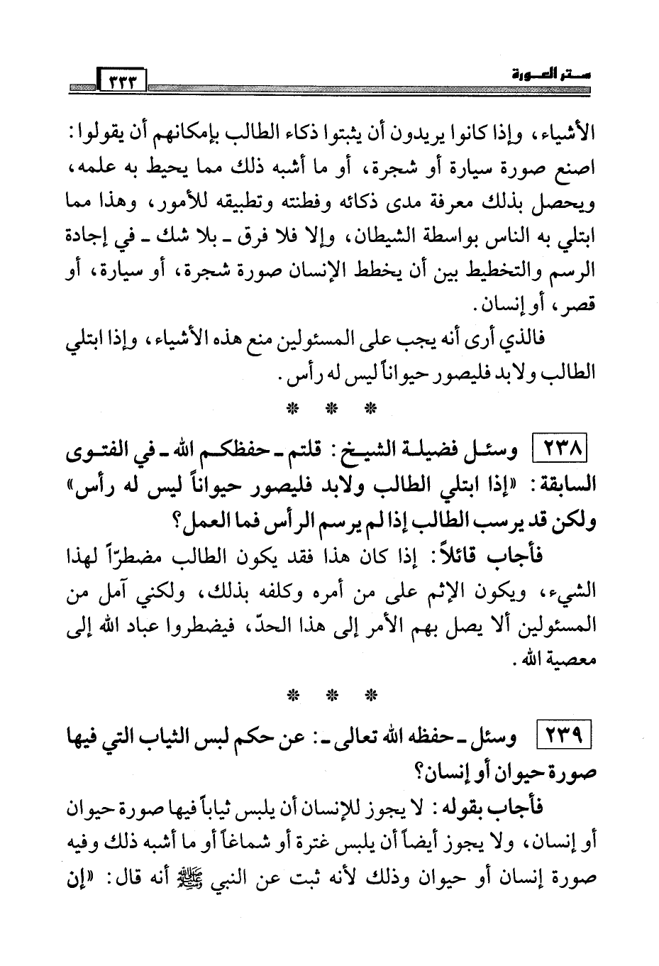 238 وسئل فضيلة الشيخ: قلتم - حفظكم الله - في الفتوى السابقة: ((إذا ابتلي الطالب ولابد فليصور حيواناً ليس له رأس)) ولكن قد يرسم الطالب إذا لم يرسب الرأس فما العمل؟
