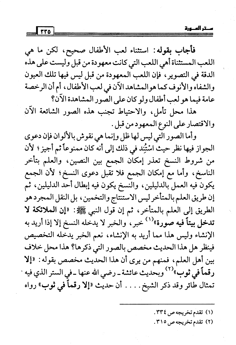فأجاب بقوله: استثناء لعب الأطفال صحيح، لكن ما هي اللعب المستثناة أهي اللعب التي كانت معهودة من قبل وليست على هذه الدقة في التصوير، فإن اللعب المعودة من قبل ليس فيها تلك العيون والشفاه والأنوف كما هو المشاهد الآن في لعب الأطفال، أم أن الرخصة عامة فيما هو لعب أطفال ولو كان على الصور المشاهدة الآن؟