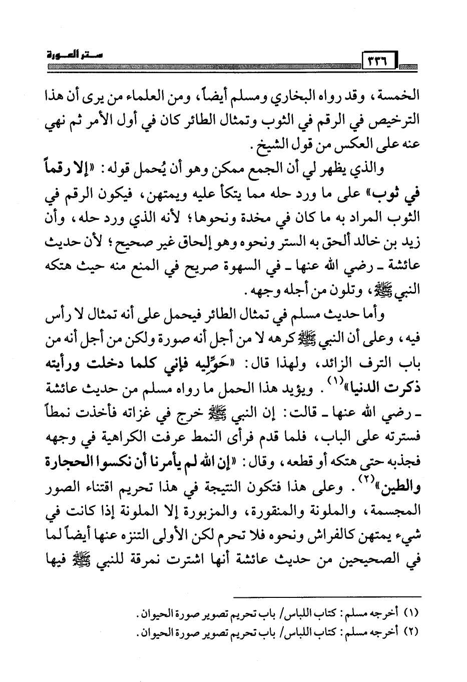 وأما حديث مسلم في تمثال الطائر فيحمل على أنه تمثال لا رأس، وعلى أن النبي صَلَّى اللَّهُ عَلَيْهِ وَسَلَّمَ كرهه لا من أجل أنه صورة ولكن من أجل أنه من باب الترف الزائد، ولهذا قال: ((حوليه فإني كلما دخلت ورأيته ذكرت الدنيا)) (¬1) . ويؤيد هذا الحمل ما رواه مسلم من حديث عائشة – رضى الله عنها – قالت: إن النبي صَلَّى اللَّهُ عَلَيْهِ وَسَلَّمَ خرج في غزاته فأخذت نمطاً فسترته على الباب، فلما قدم فرأي النمط عرفت الكراهية في وجهه فجذبته حتى هتكه أو قطعه، وقال: ((إن الله لم يأمرنا أن نكسوا الحجارة والطين)) (¬2) . وعلى هذا فتكون النتيجة في هذا تحريم اقتناء الصور المجسمة، والملونة والمنقورة، والمزبورة إلا الملونة إذا كانت في شيء يمتهن كالفراش ونحوه فلا تحرم لكن الأولى التنزه عنها أيضاً لما في الصحيحين من حديث عائشة أنها اشترت نمرقة للنبي صَلَّى اللَّهُ عَلَيْهِ وَسَلَّمَ فيها