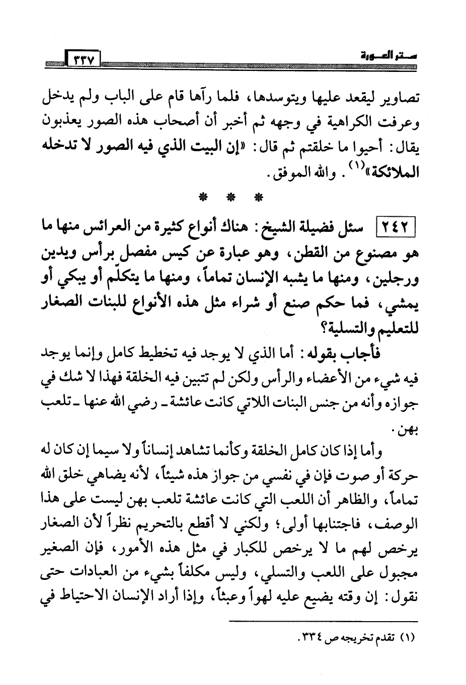 فأجاب بقوله: أما الذي لا يوجد فيه تخطيط كامل وإنما يوجد فيه شيء من الأعضاء والرأس ولكن لم تتبين فيه الخلقة فهذا لا شك في جوازه وأنه من جنس البنات اللاتي كانت عائشة - رضى الله عنها - تلعب بهن.