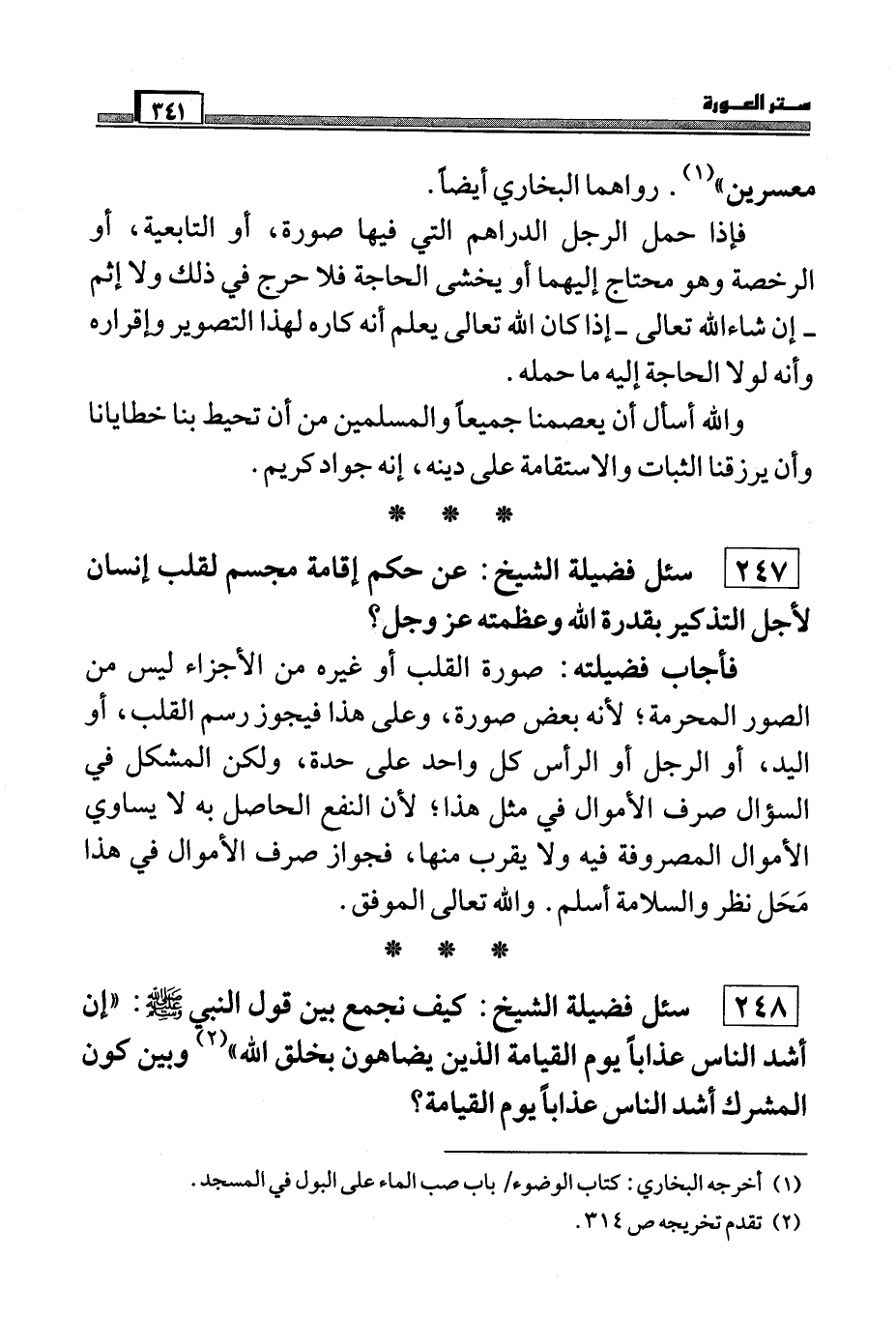 فأجاب بقوله: صورة القلب أو غيره من الأجزاء ليس من الصور المحرمة، لأنه بعض صوره، وعلى هذا فيجوز رسم القلب، أو اليد، أو الرجل أو الرأس كل واحد على حدة، ولكن المشكل في السؤال صرف الأموال في مثل هذا، لأن النفع الحاصل به لا يساوي الأموال المصروفة فيه ولا يقرب منها، فجواز صرف الأموال في هذا محل نظر والسلامة أسلم. والله تعالى الموفق.