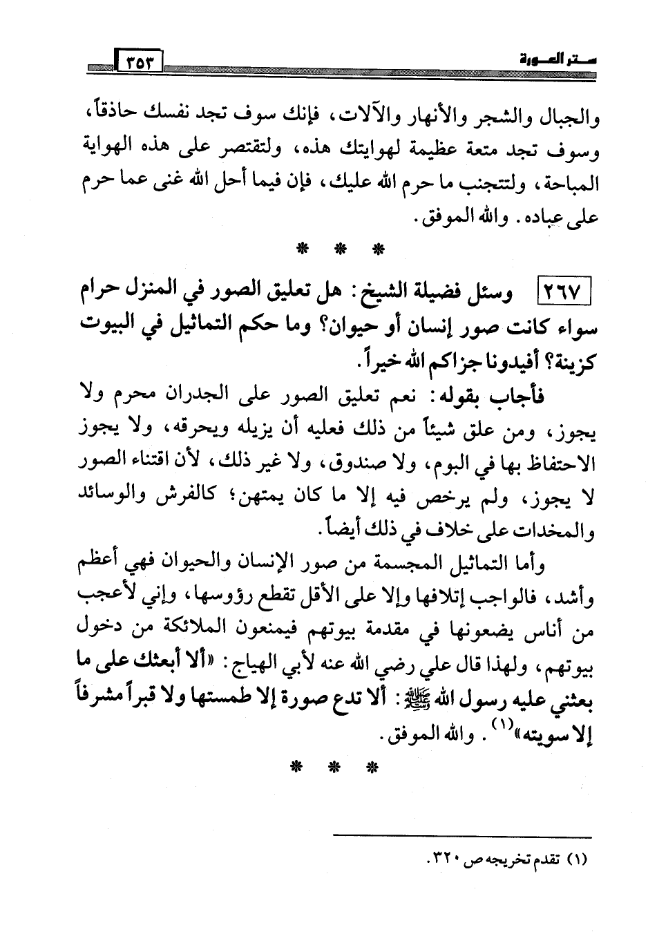 267 وسئل فضيلة الشيخ: هل تعليق الصور في المنزل حرام سواء كانت صور إنسان أو حيوان؟ وما حكم التماثيل في البيوت كزينة؟ أفيدونا جزاكم الله خيراً.