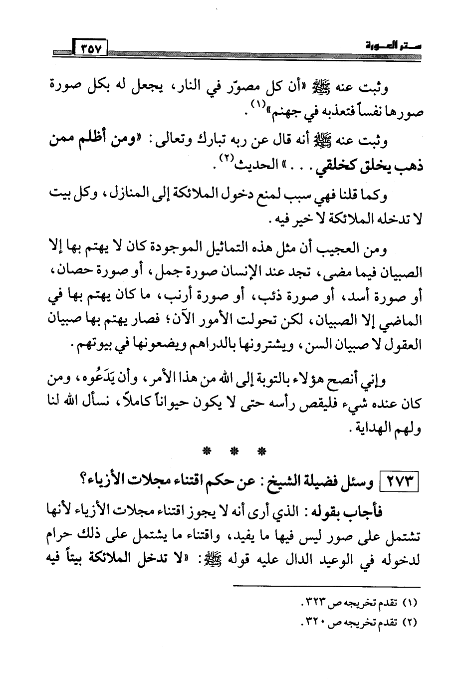 فأجاب بقوله: الذي أرى أنه لا يجوز اقتناء مجلات الأزياء لأنها تشتمل على صور ليس فيها ما يفيد، واقتناء ما يشتمل على ذلك حرام لدخوله في الوعيد الدال عليه قوله صَلَّى اللَّهُ عَلَيْهِ وَسَلَّمَ: ((لا تدخل الملائكة بيتاً فيه
