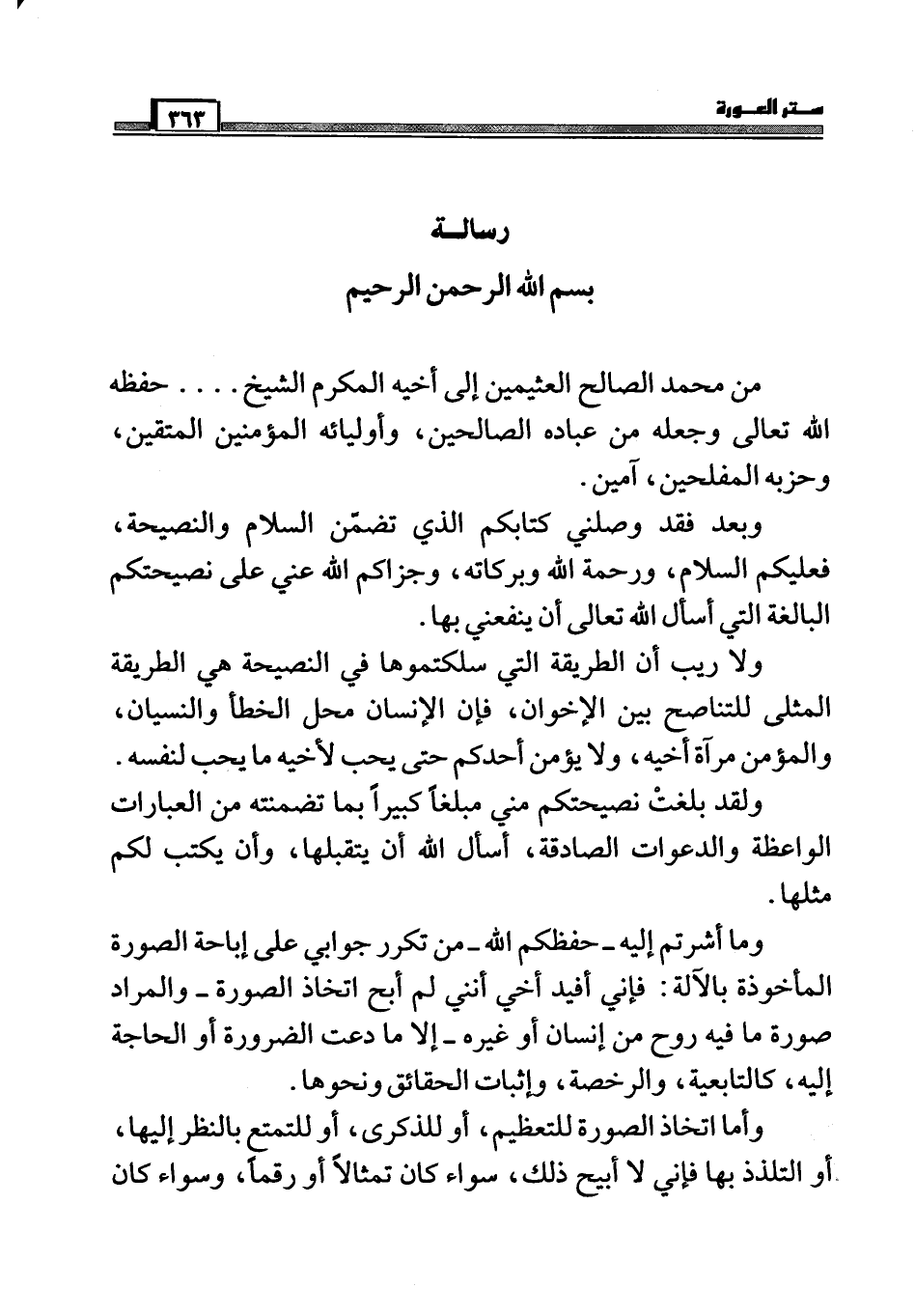 من محمد بن الصالح العثيمين إلى أخيه المكرم الشيخ. .. . حفظه الله تعالى وجعله من عباده الصالحين، وأوليائه المؤمنين المتقين، وحزبه الملحين، آمين.