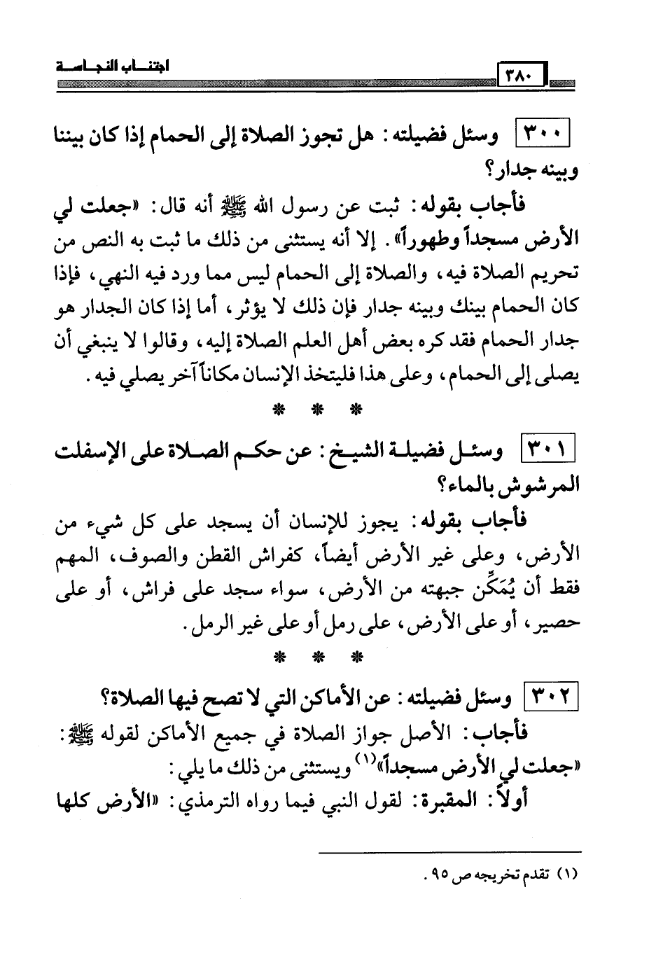 فأجاب فضيلته بقوله: الصلاة فوق سطوح حماماتنا المعروفة لا بأس بها، لأن الحمامات عندنا لا تستقل ببناء خاص ويكون سطحها سطح جميع البيوت، والصلاة فوق سطح مجامع الفضلات النجسة لا بأس بها أيضاً لدخولها في عموم قوله صَلَّى اللَّهُ عَلَيْهِ وَسَلَّمَ: ((جعلت لي الأرض مسجداً وطهوراً)) (¬1) .