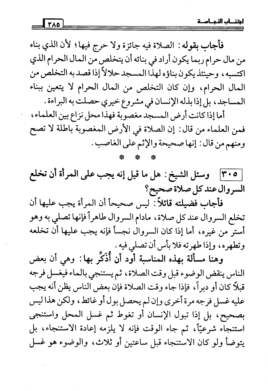 305 وسئل الشيخ: هل ما قيل إنه يجب على المرأة أن تخلف السروال عند كل صلاة صحيح؟